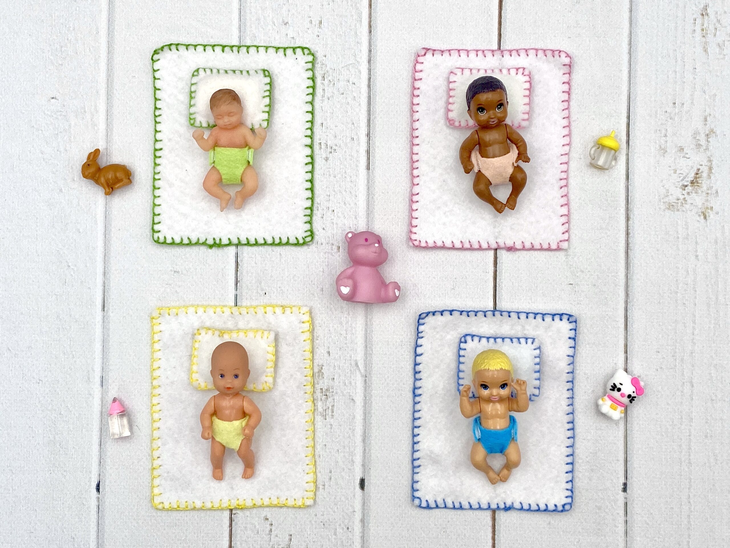 Ręcznie szyty miniaturowy kocyk i poduszka dla miniaturowych lalek niemowlaków takich jak bobas Barbie lub Steffi, Krissy, Zuru My Mini Baby i wszelkich innych miniaturowych dzidziusiów w podobnych rozmiarach. Uszyte z białego miękkiego filcu, obszyte muliną w niebieskim kolorze, poduszka wypełniona watą. Zestaw dostępny jest w innych pastelowych kolorach: niebieski, zielony, różowy i żółty.