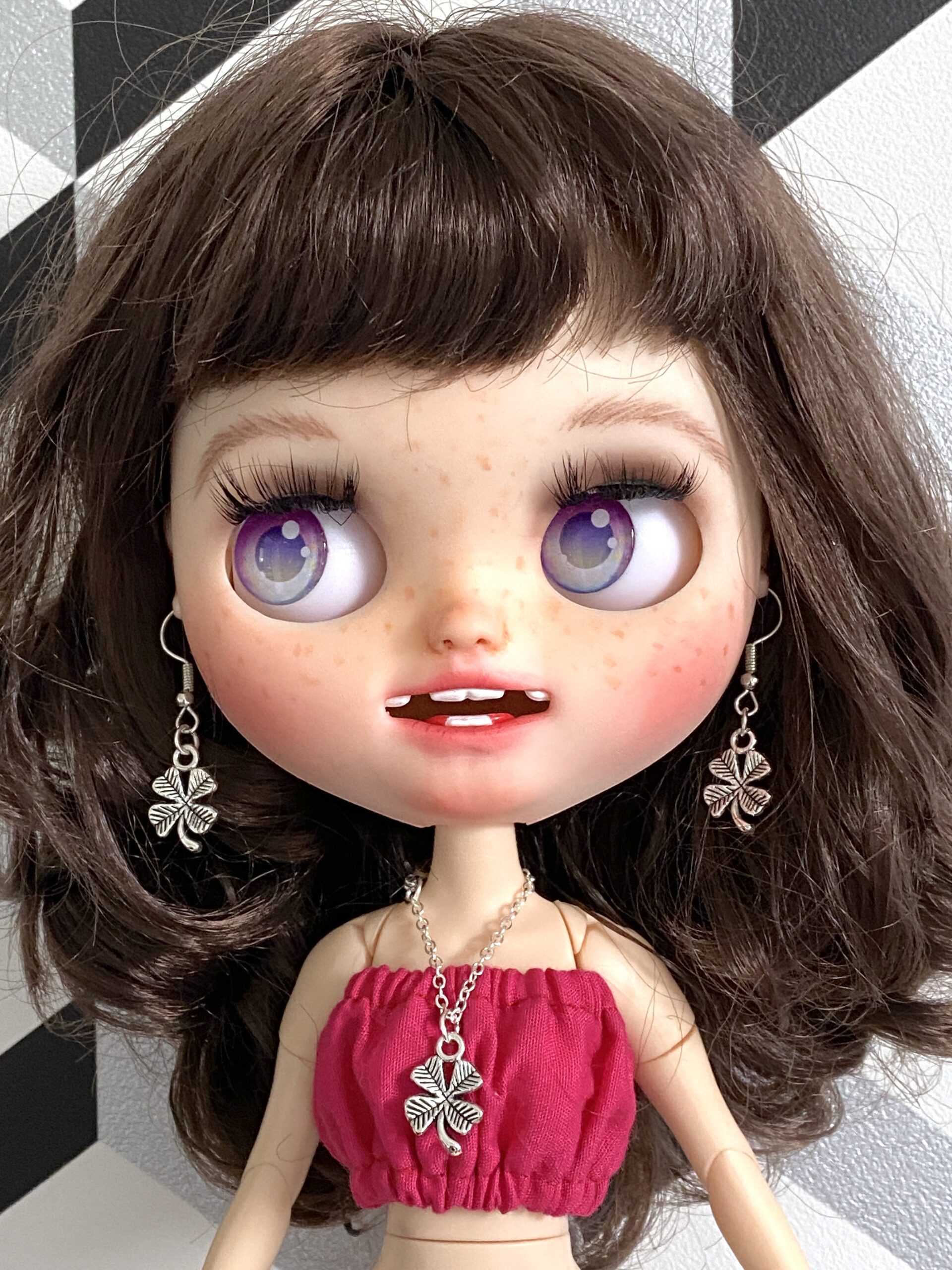 Ręcznie robione kolczyki i naszyjnik z koniczynkami dla lalek takich jak Blythe, Pullip, Dal i innych lalek tego typu z dużymi głowami.