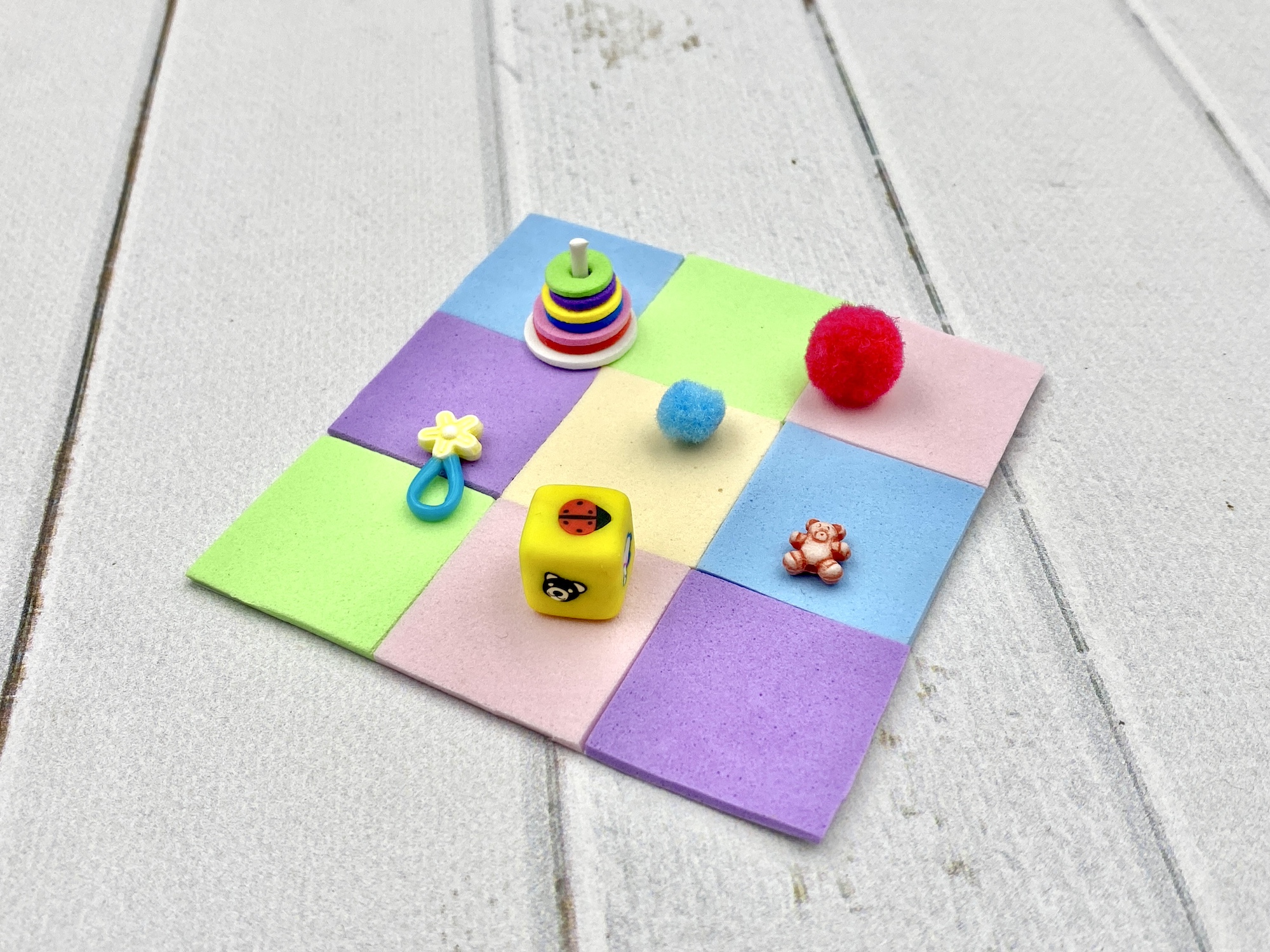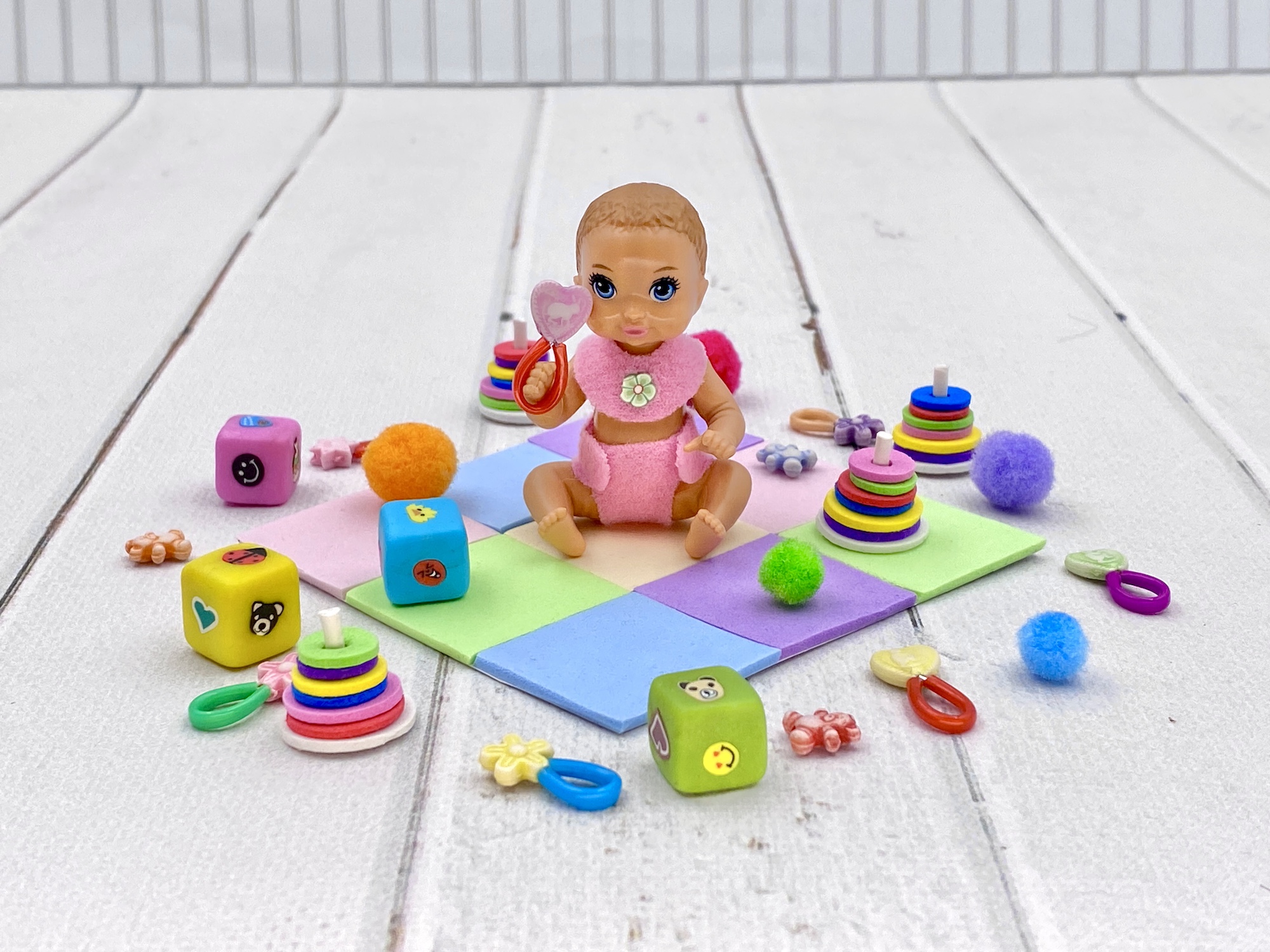 A handmade toy set for miniature babie dolls like Barbie baby, Steffi baby, Zuru My Mini Baby, and all other miniature babie dolls of similar size. Also perfect for dollhouses, made of pastel foam and pastel modeling clay. The set includes: