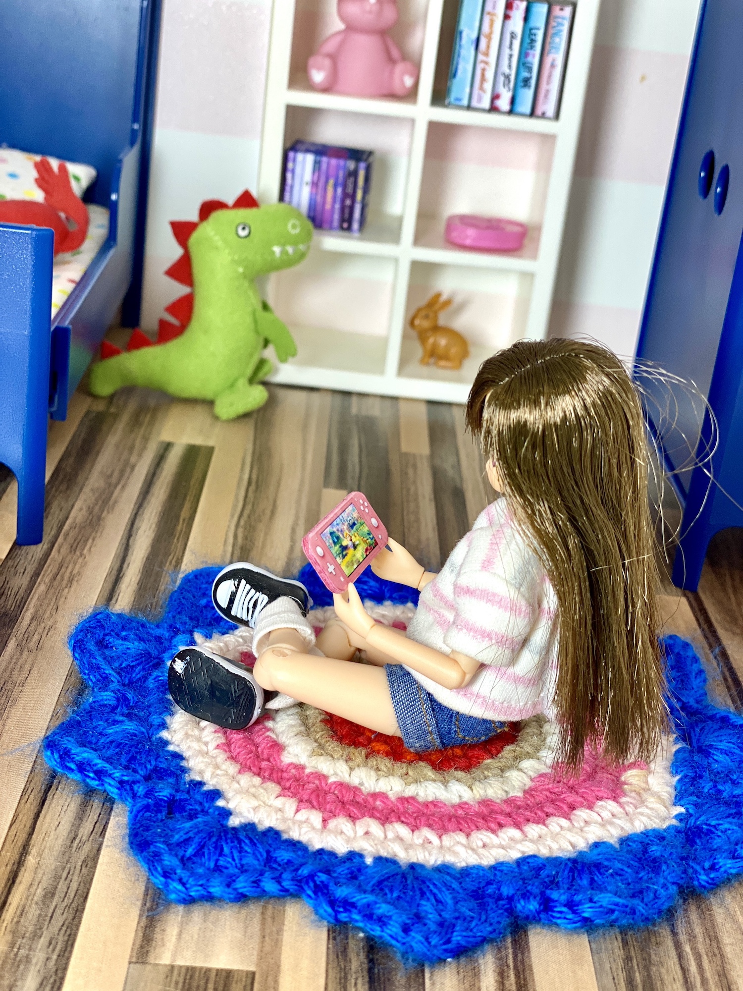 Miniaturowa konsola do gier Nintendo Switch Lite dla lalek, w skali 1:12, zrobiona z introligatorskiej tektury, papieru fotograficznego i taśmy. Konsola idealna dla lalek typu Petite Blythe, LPS Blythe Little Dal, Little Pullip, Dollcena, Obitsu 11, Nendoroid, Zjakazumi, Phicen, Sylvanian Families, Calico Critters i wielu innych lalek.