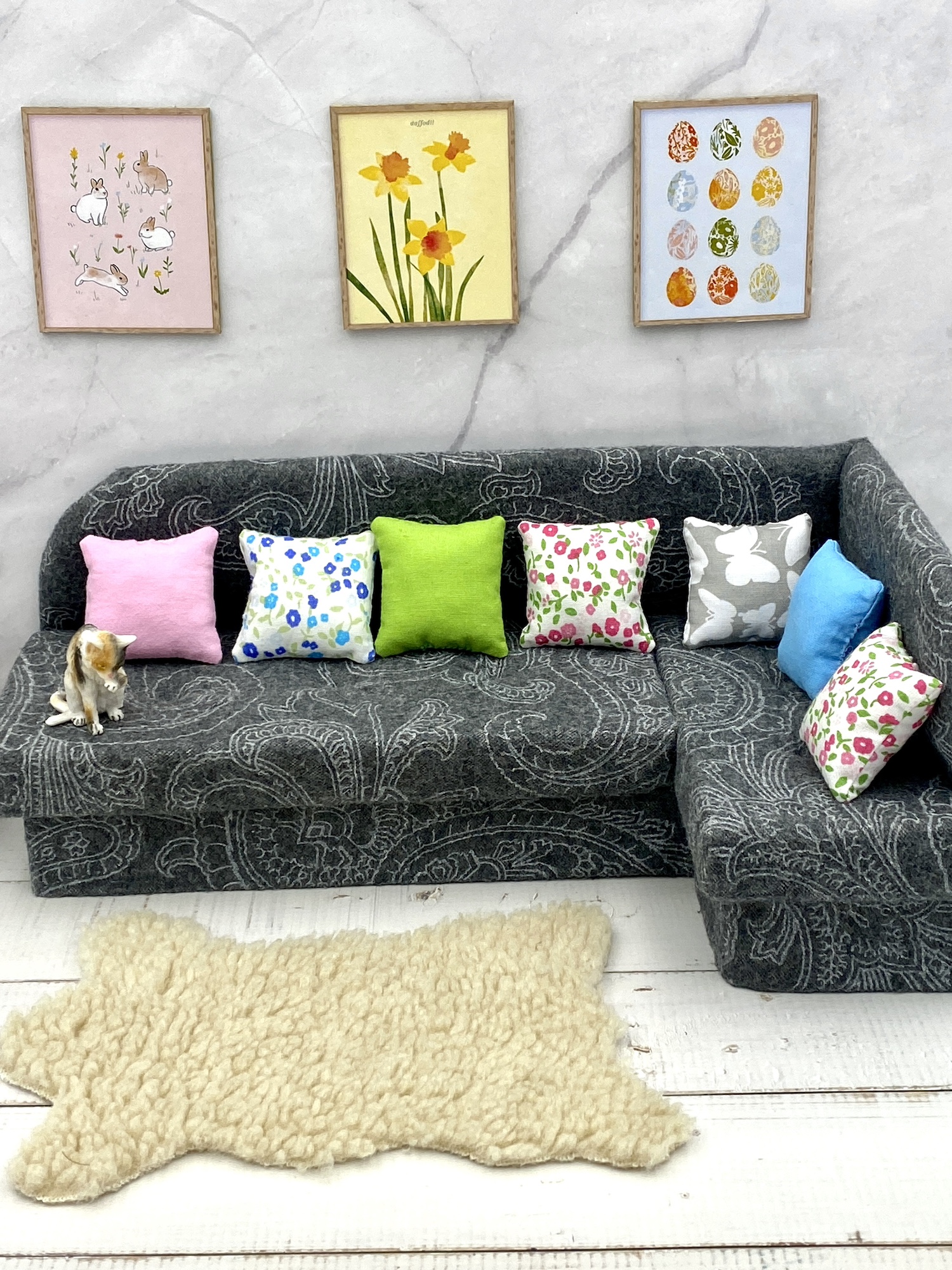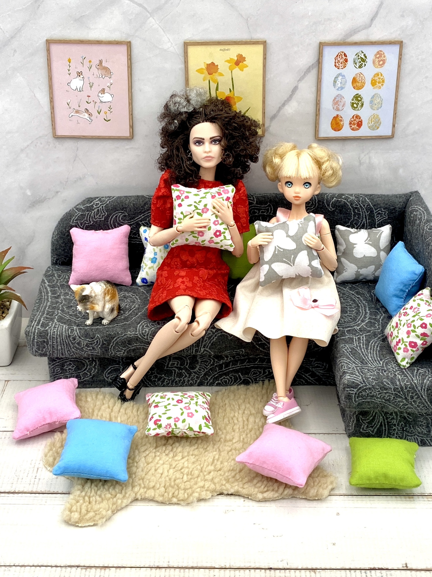 Ręcznie szyta miniaturowa poduszka do domku dla lalek w skali 1:6, dioramy, room boxu i innych tego typu dekoracji idealna na Wielkanoc. Pasuje do większości lalek min. Barbie, Blythe, Azone, Monster High i wielu innych lalek podobnych rozmiarów. Poduszka jest idealnym akcentem na Wielkanoc, na kanapę, sofę czy krzesło lub dla lalek lubiących walkę na poduszki 😉 Poduszka wykonana z bawełnianej tkaniny, wypełniona wypełnieniem do poduszek. Do wyboru jest 6 Wielkanocnych wzorów.