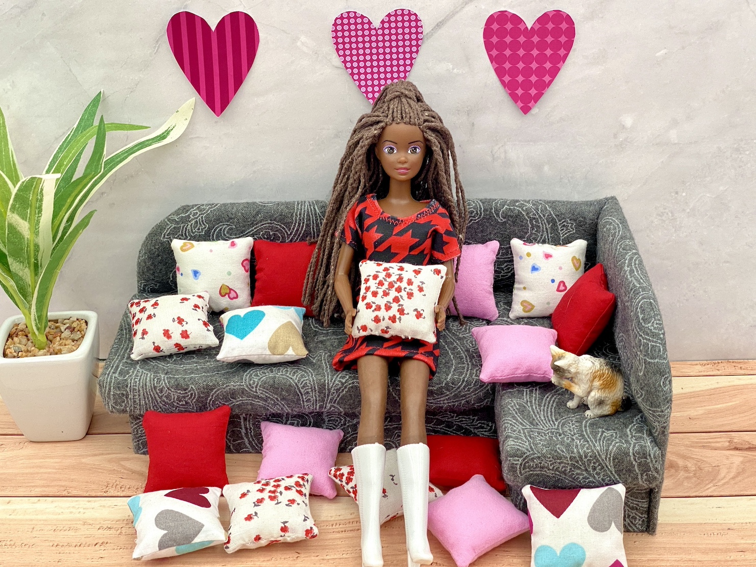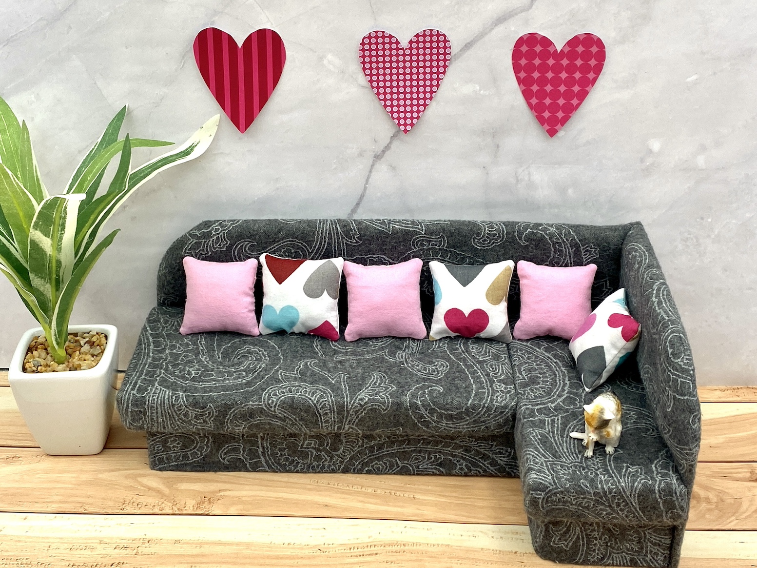 Ręcznie szyta miniaturowa poduszka na Walentynki do domku dla lalek w skali 1:6, dioramy, room boxu i innych tego typu dekoracji. Pasuje do większości lalek min. Barbie, Blythe, Azone, Monster High i wielu innych lalek podobnych rozmiarów. Poduszka jest świątecznym walentynkowym akcentem na kanapę, sofę czy krzesło lub dla lalek lubiących walkę na poduszki 😉 Poduszka wykonana z bawełnianej tkaniny, wypełniona wypełnieniem do poduszek. Do wyboru 5 wzorów/kolorów.