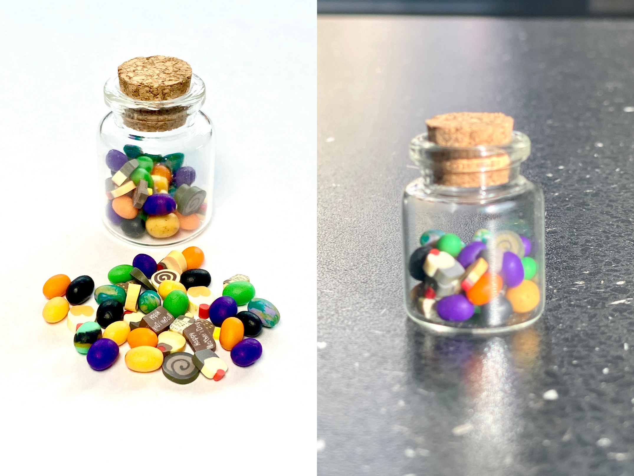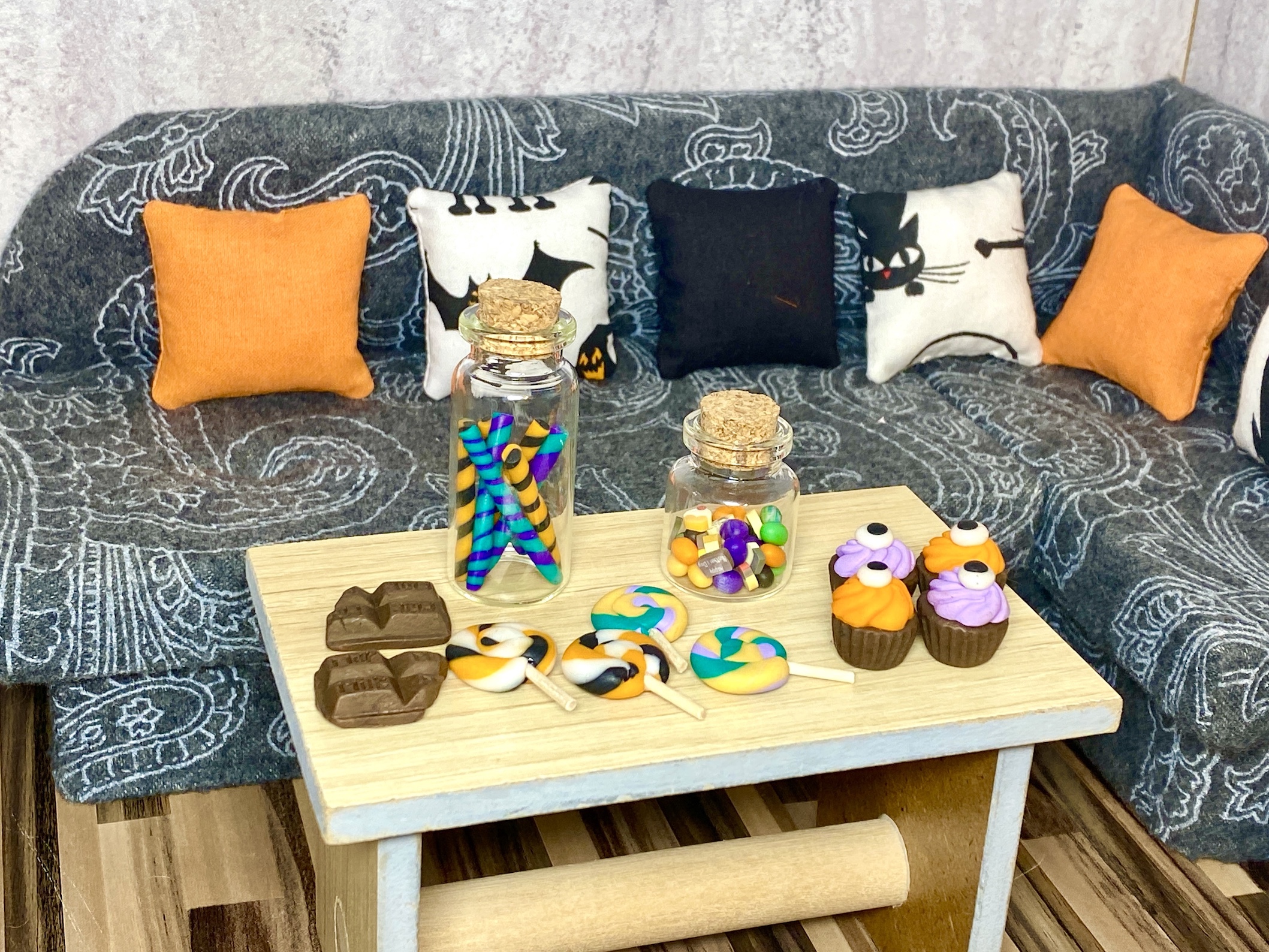Miniaturowe ciastka i słodycze w słoiczkach na Halloween, zrobione z modeliny. Idealne do domków dla lalek, miniaturowych szafek czy dioramy, świetny dodatek na Halloween waszych lalek. Barbie czy Blythe będzie w siódmym niebie 😉 Do wyboru 7 rodzajów Halloweenowych słodyczy: