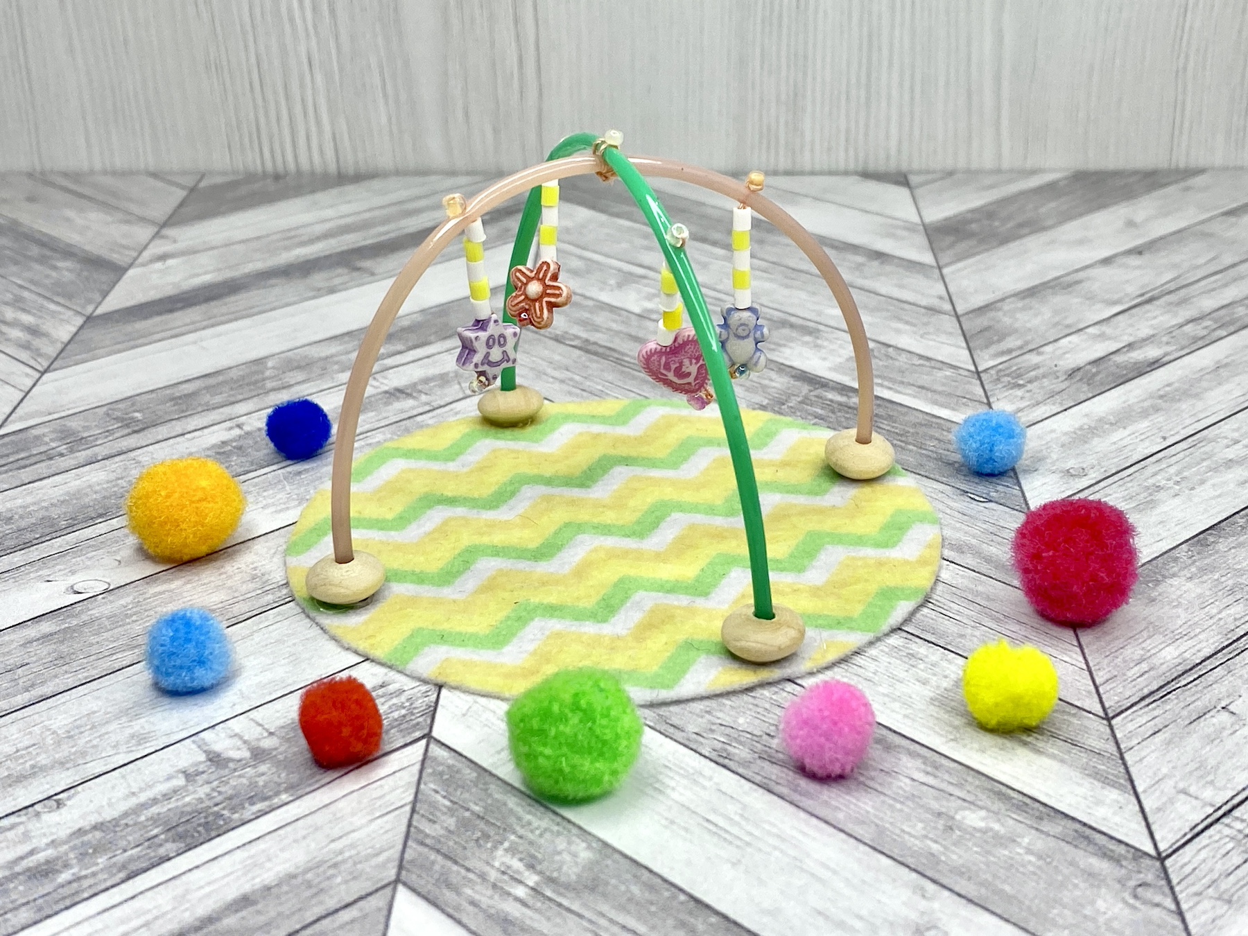 Ręcznie wykonany miniaturowy baby gym / centrum aktywności, idealny do pokoju dziecięcego w domku dla lalek, miniaturowego pokoju dziecięcego, a także dla miniaturowych lalek niemowlaków takich jak bobas Barbie, bobas Skipper, bobas Steffi, dzidziuś Happy Family, Krissy, Zuru My Mini Baby i wszelkich innych miniaturowych lalek dzidziusiów w podobnych rozmiarach.