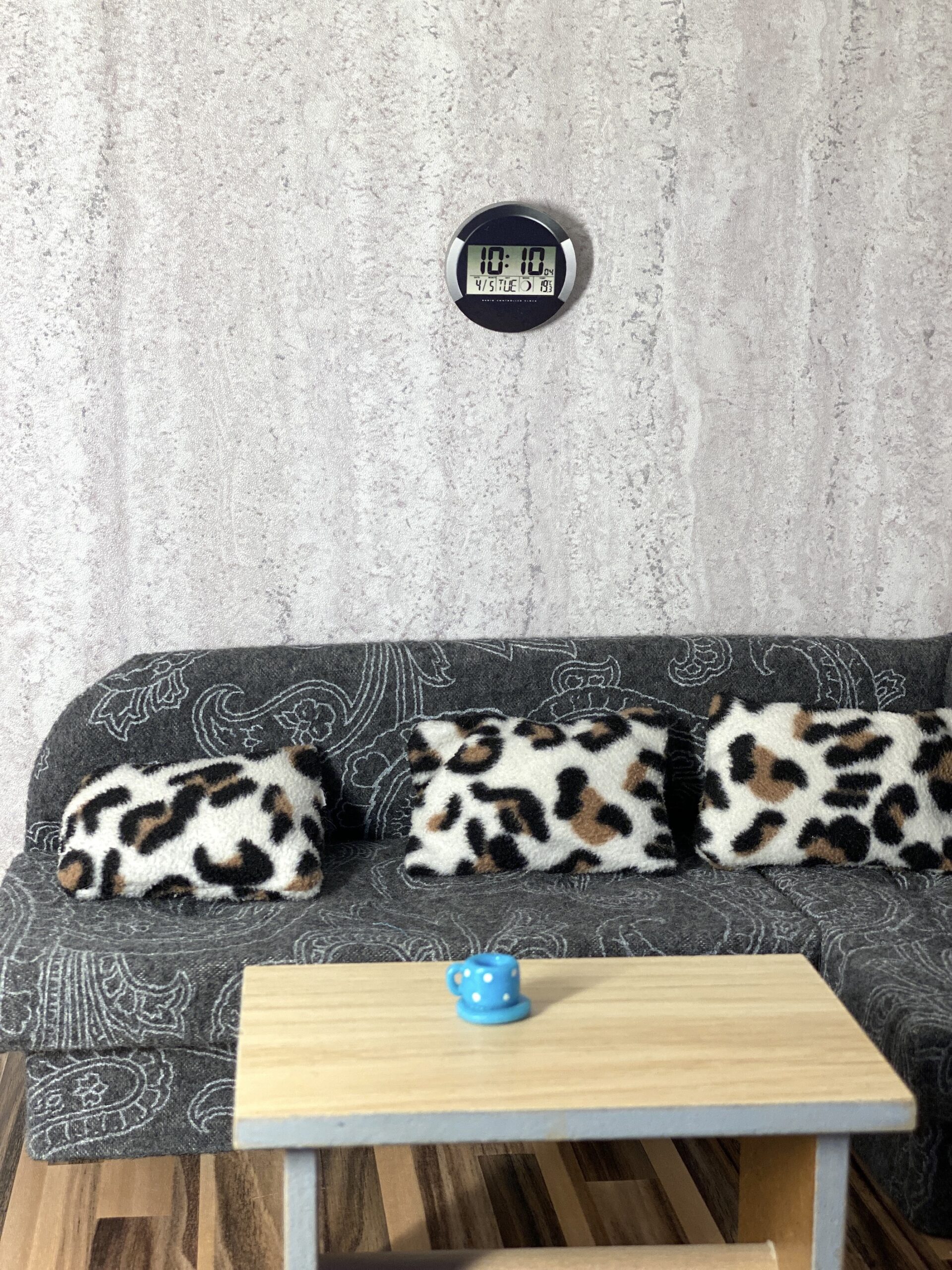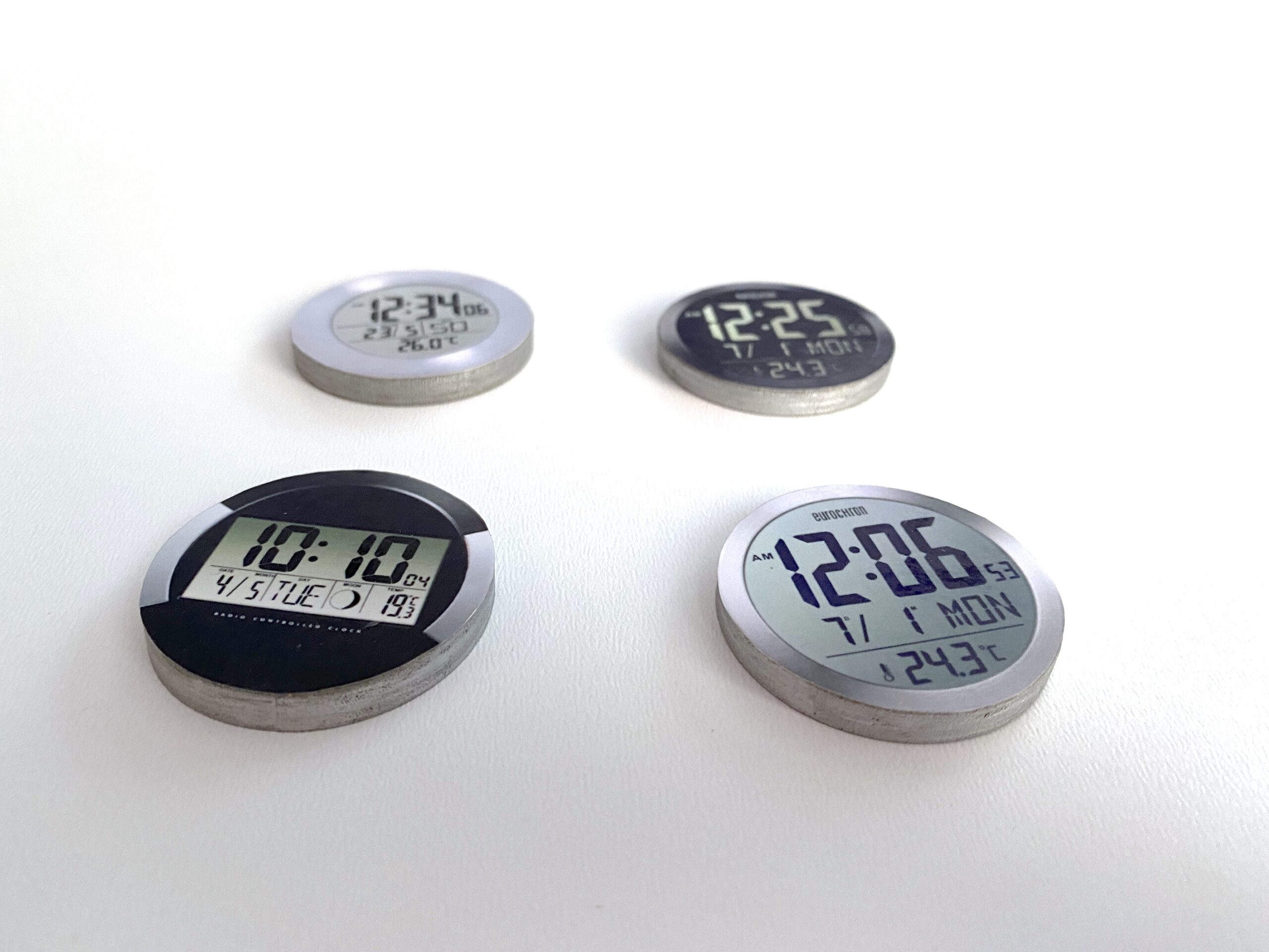 Ręcznie robiony miniaturowy elektroniczny zegar ścienny, idealny do domków dla lalek w skali 1:6. Tarcza wydrukowana jest na papierze fotograficznym, pokryta taśmą klejącą w celu zapobiegnięcia uszkodzeniom, naklejona na drewniany krążek pokryty srebrną farbą olejną.