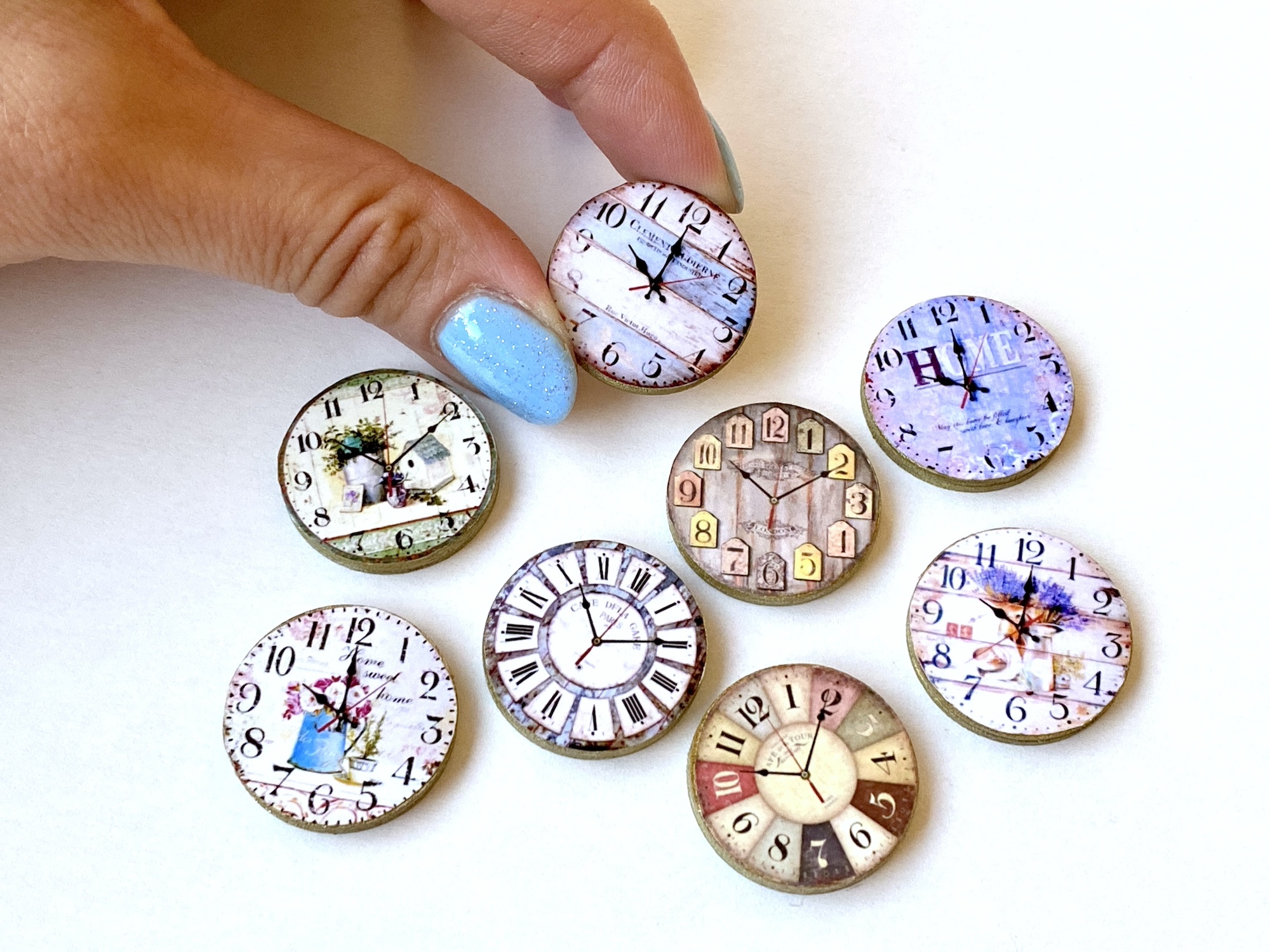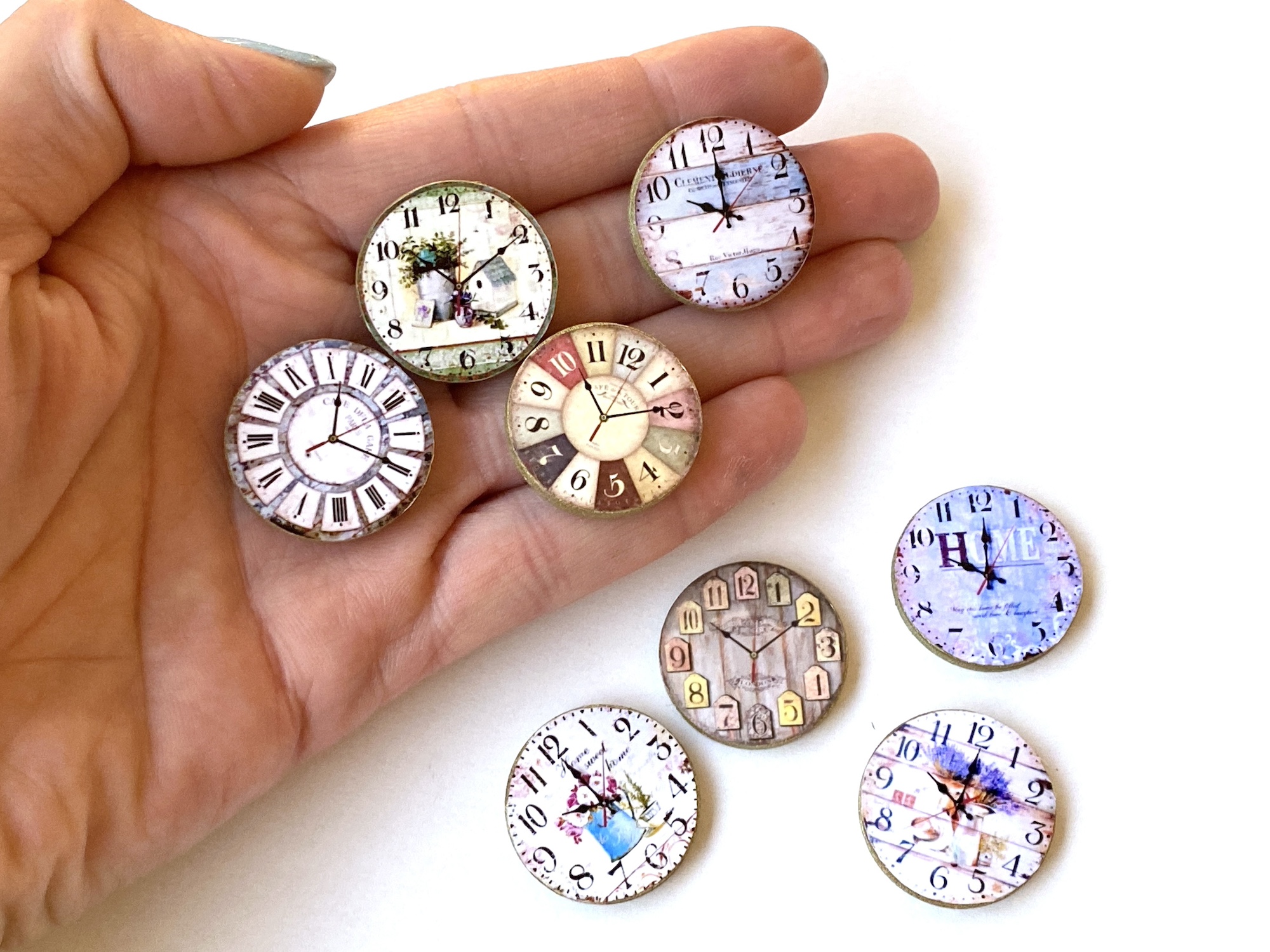 Ręcznie robiony miniaturowy zegar ścienny w stylu retro, idealny do domku dla lalek w skali 1:12. Ładny dodatek dla lalek takich jak Petite Blythe, LPS Blythe Little Dal, Little Pullip, Dollcena, Obitsu 11, Nendoroid, Zjakazumi, Phicen, Sylvanian Families, Calico Critters i wielu innych lalek podobnych rozmiarów. Tarcza wydrukowana jest na papierze fotograficznym, pokryta taśmą klejącą w celu zapobiegnięcia uszkodzeniom, naklejona na drewniany krążek pokryty złotą farbą olejną.