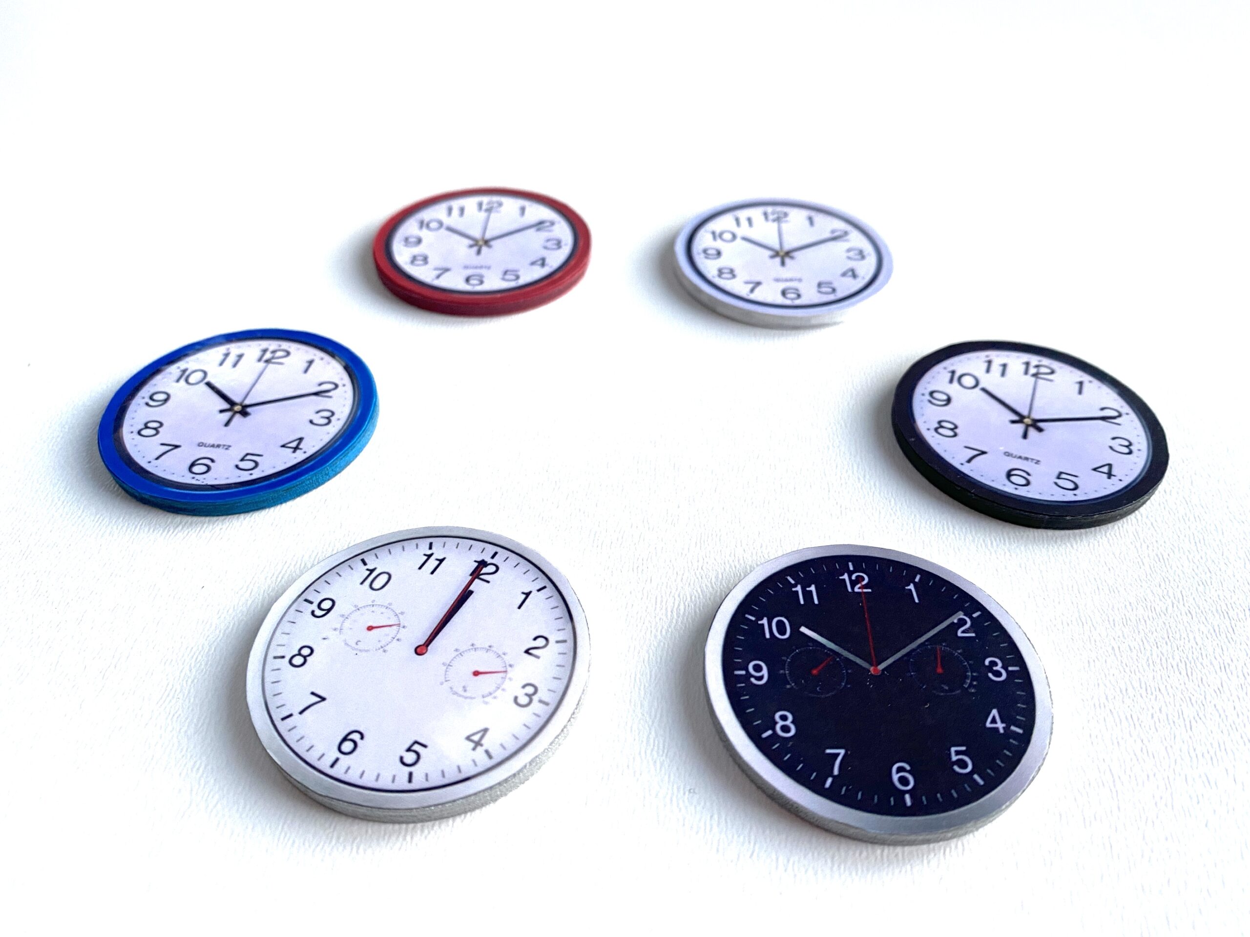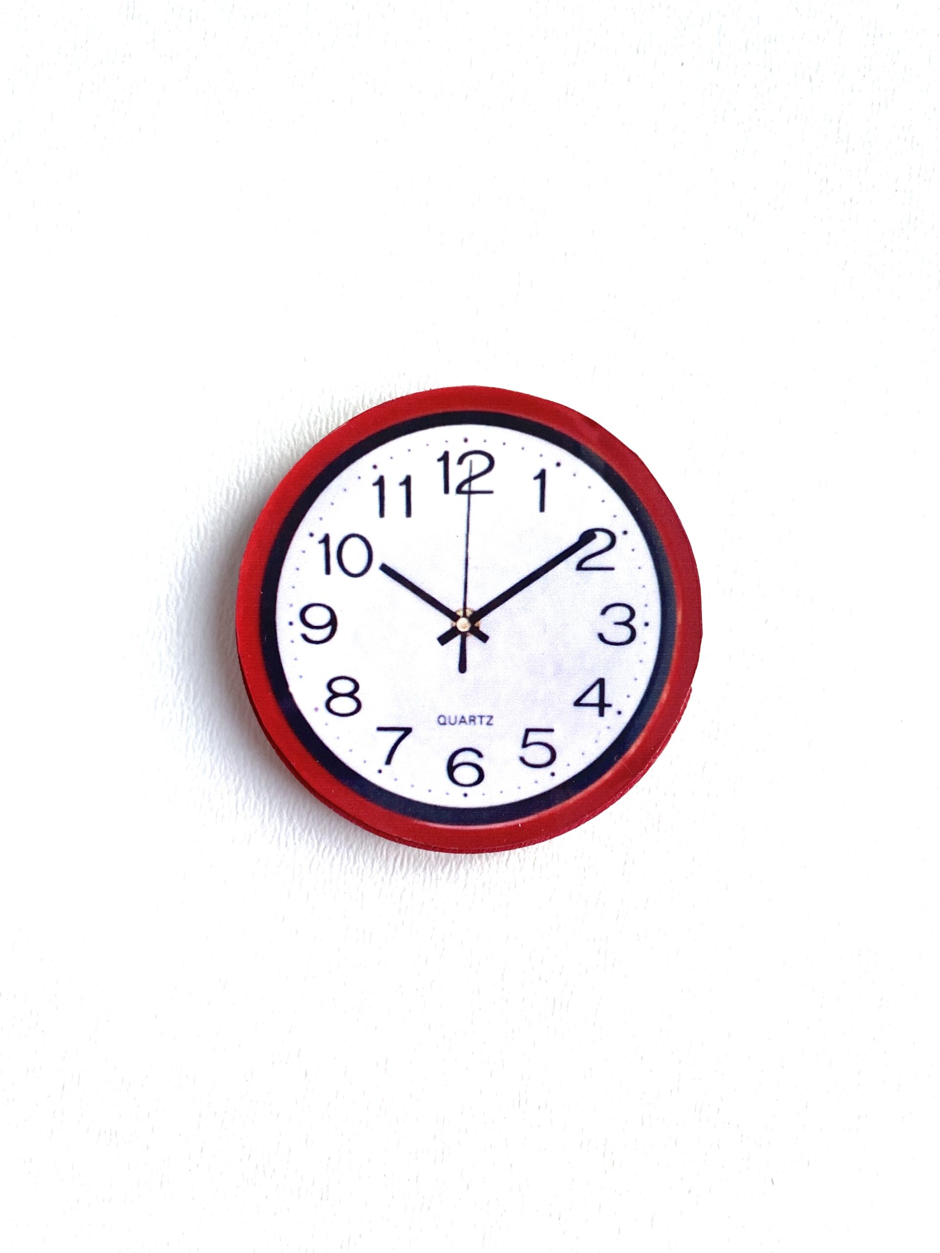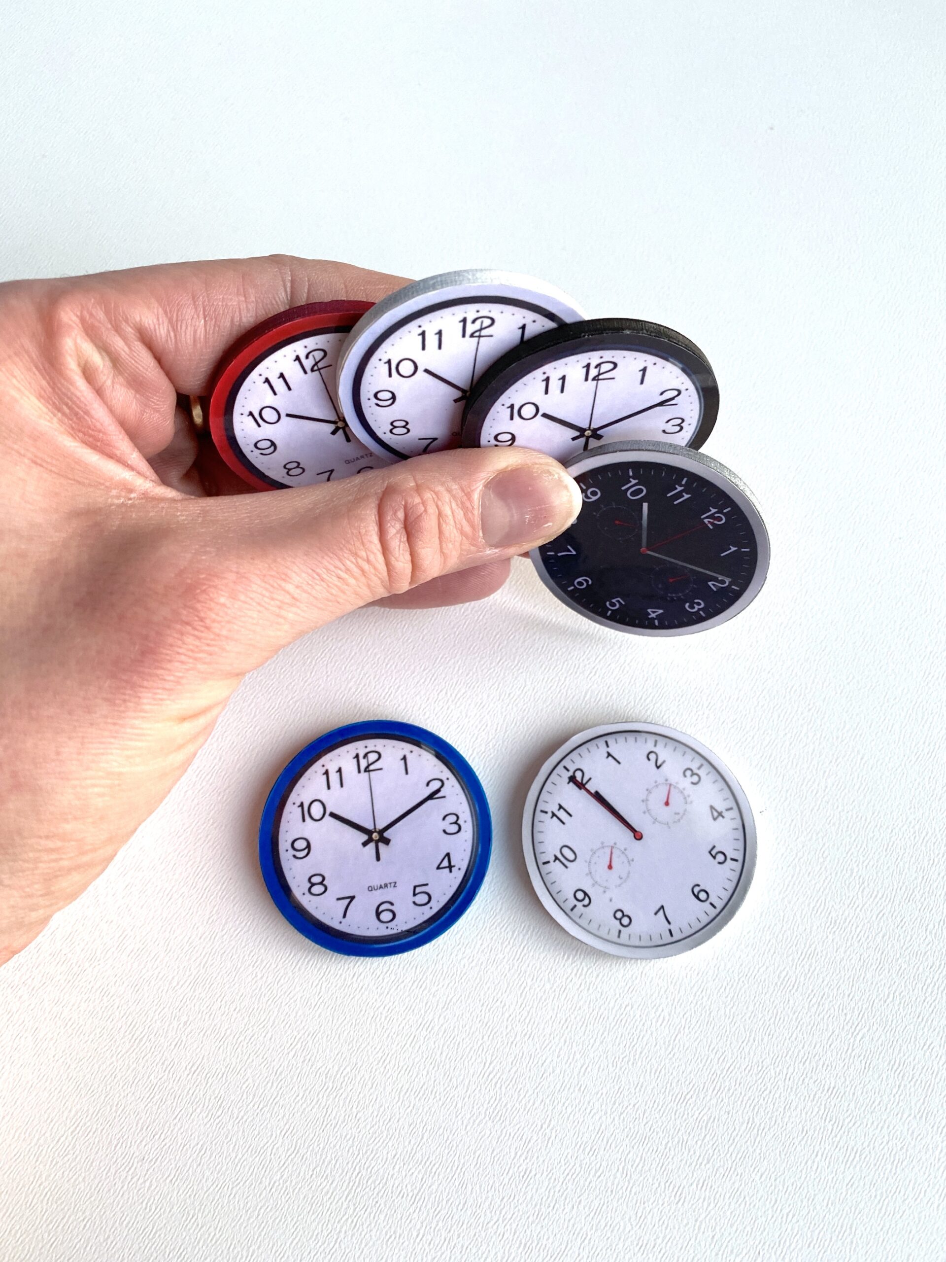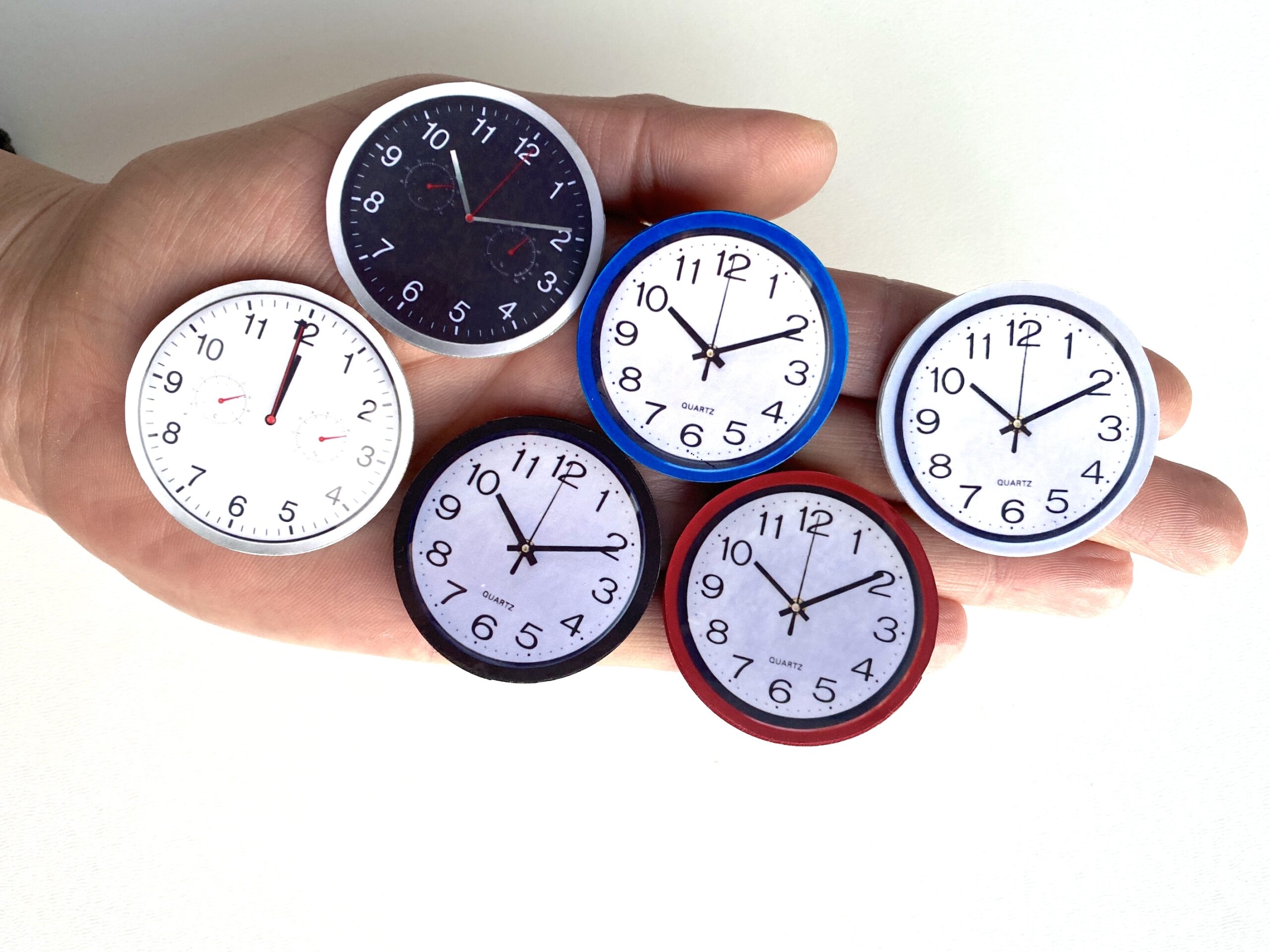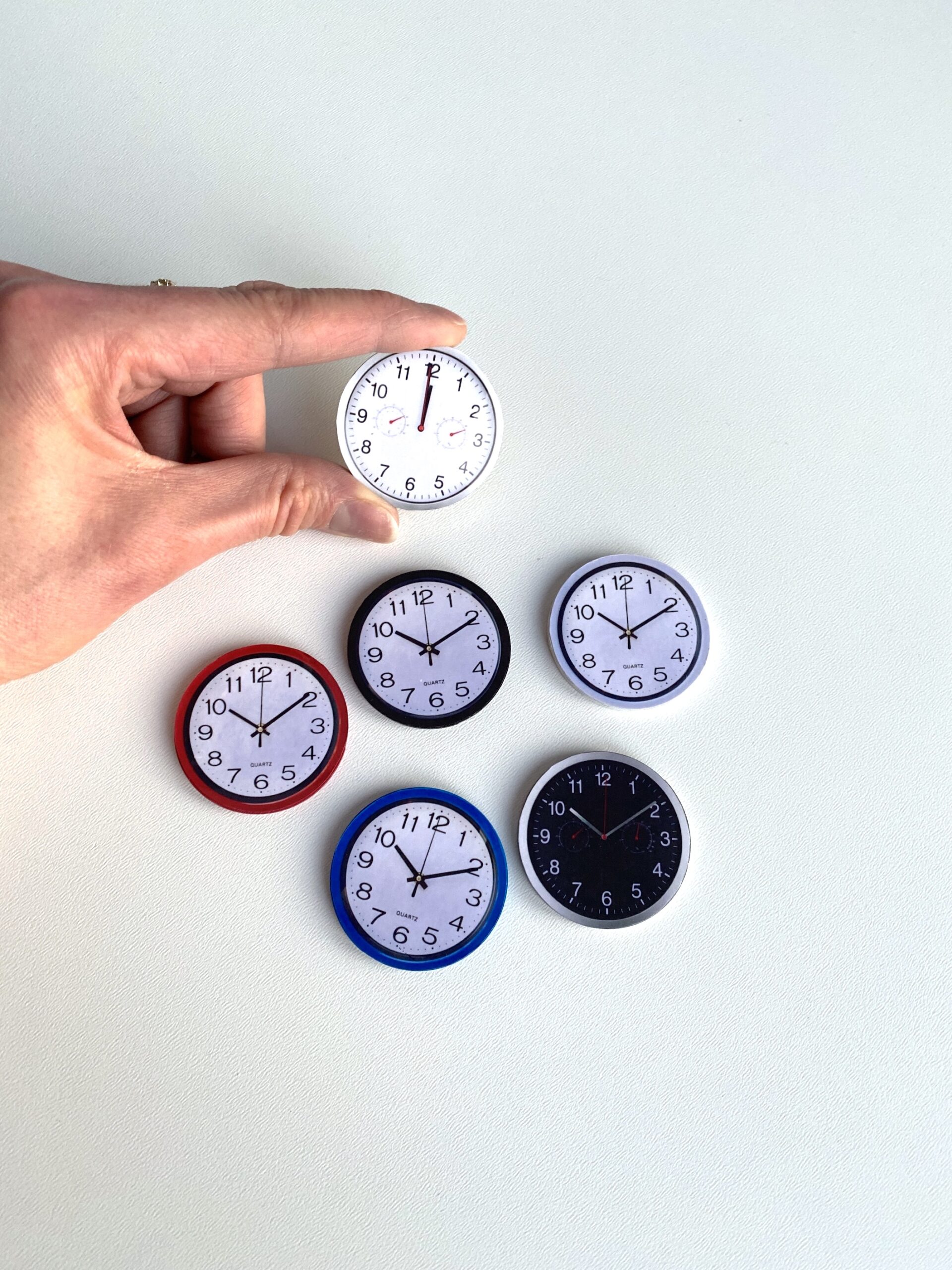 A handmade miniature wall clock with a modern dial in a variety of colors, perfect for 1:6 scale dollhouses, children’s rooms, schools, kitchens, living rooms, etc. The dial is printed on photographic paper, covered with adhesive tape to prevent damage, and mounted on a wooden disc coated with white, black, red, blue, or silver oil paint.