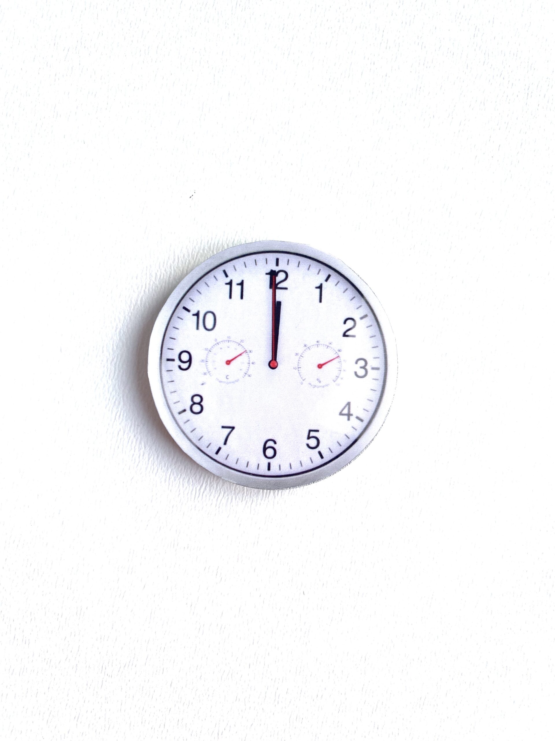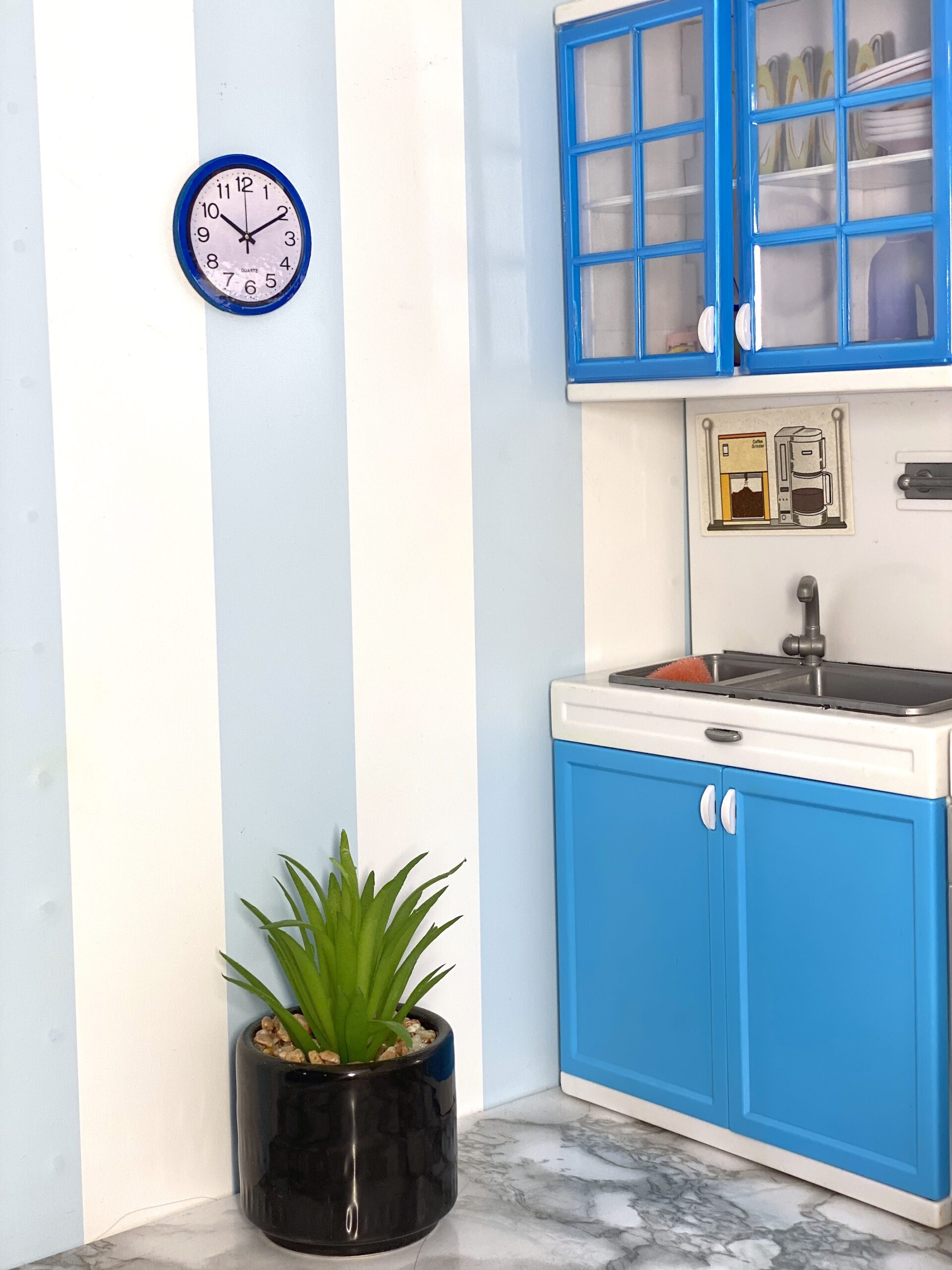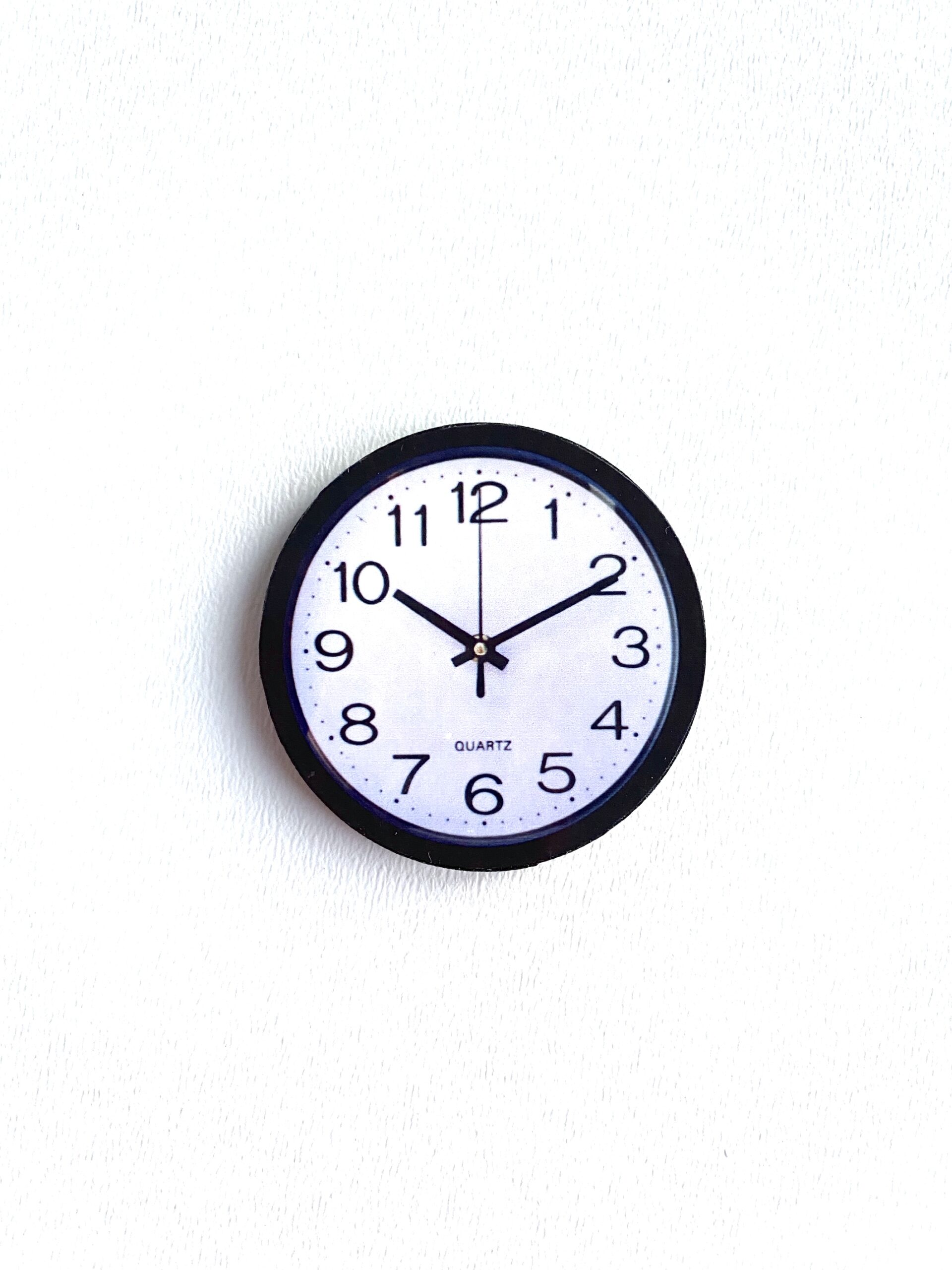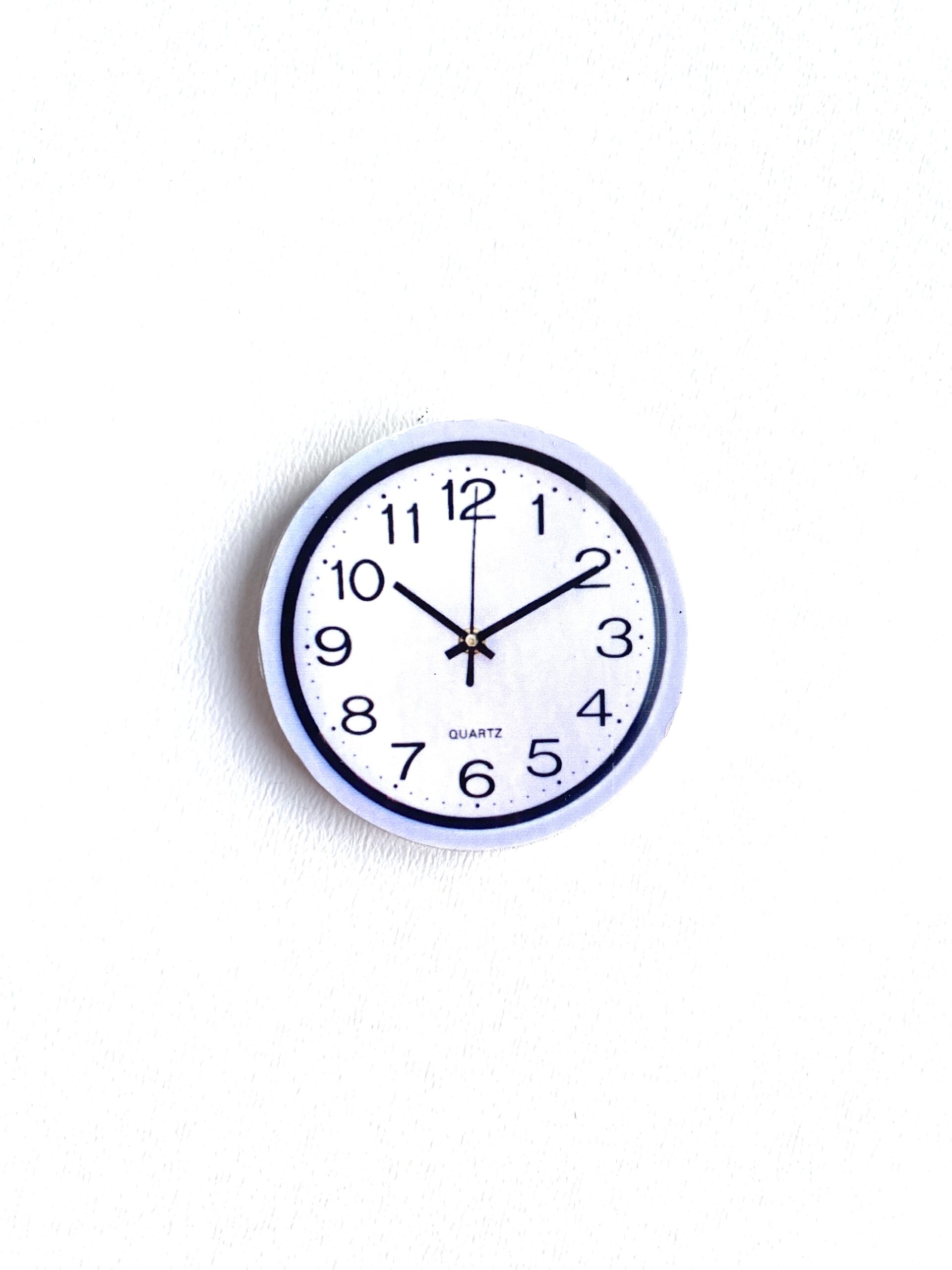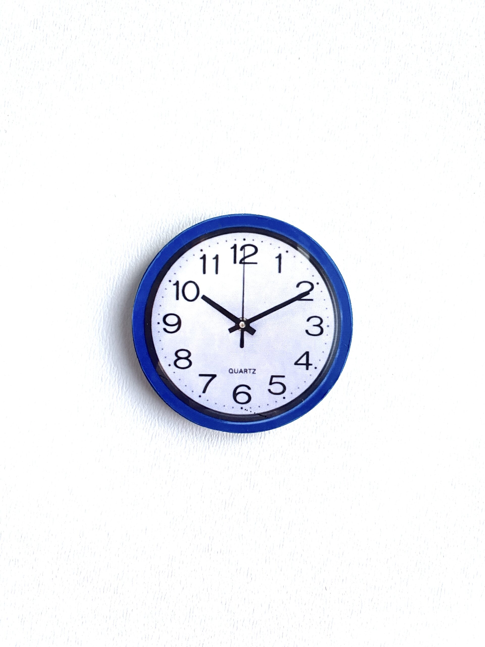 A handmade miniature wall clock with a modern dial in a variety of colors, perfect for 1:6 scale dollhouses, children’s rooms, schools, kitchens, living rooms, etc. The dial is printed on photographic paper, covered with adhesive tape to prevent damage, and mounted on a wooden disc coated with white, black, red, blue, or silver oil paint.