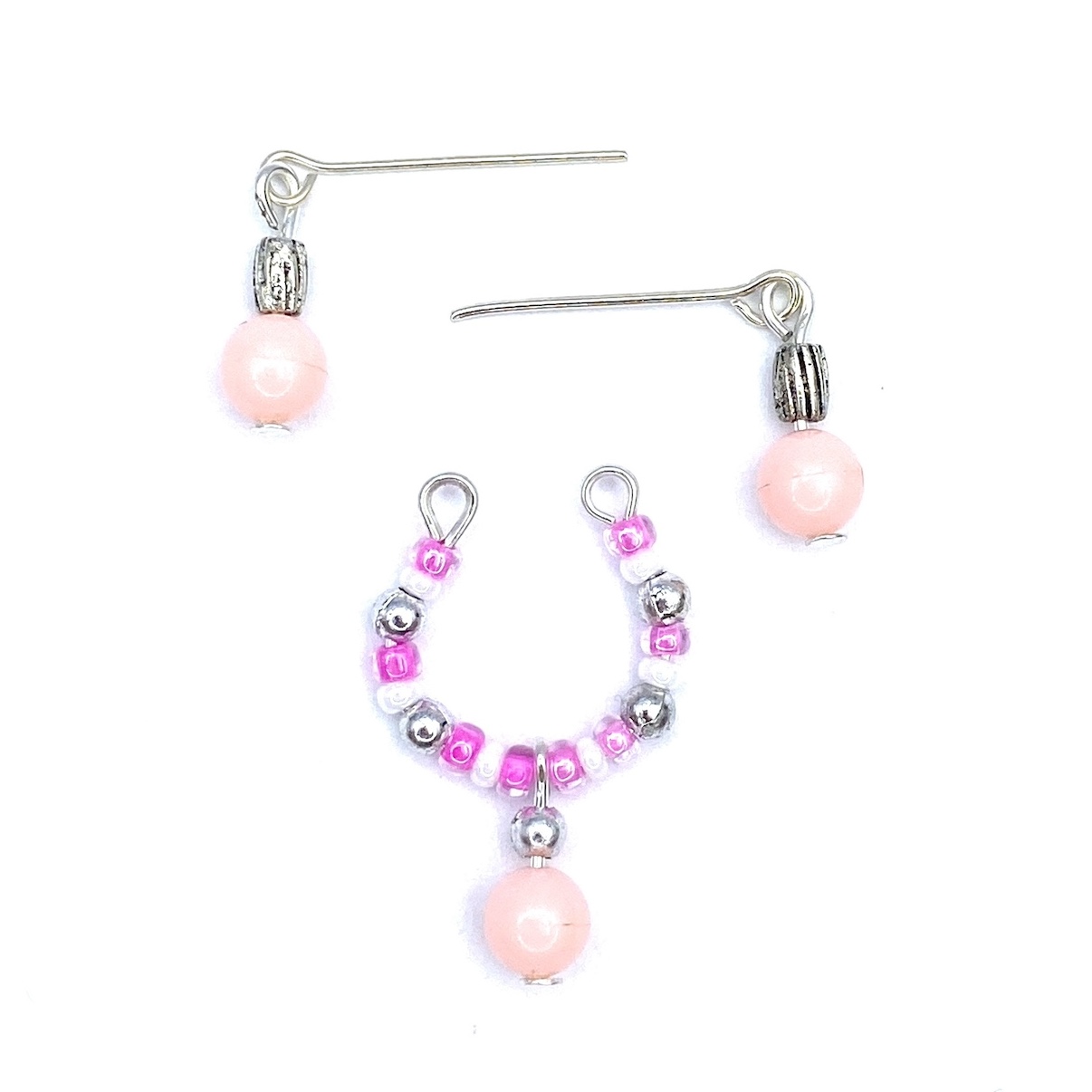 Miniaturowy ręcznie robiony zestaw biżuterii dla lalek takich jak Barbie, Fashion Royalty, Moxie, Bratz, Monster High, Rainbow High, Ever After High, LOL OMG, Disney, Licca, Jenny, Sindy i wiele innych lalek. Zestaw zawiera naszyjnik i kolczyki – zrobiony jest z różowych, białych i srebrnych koralików.