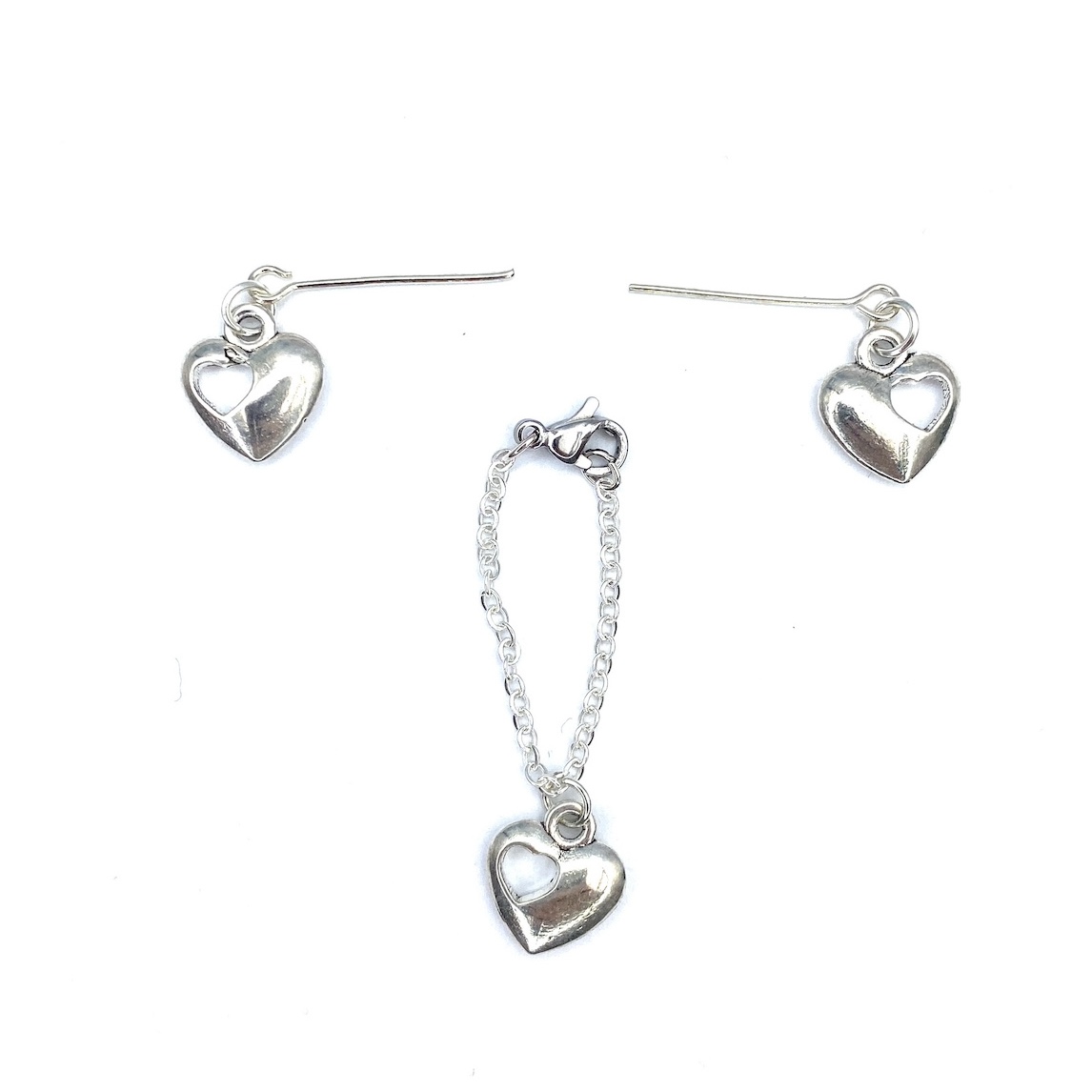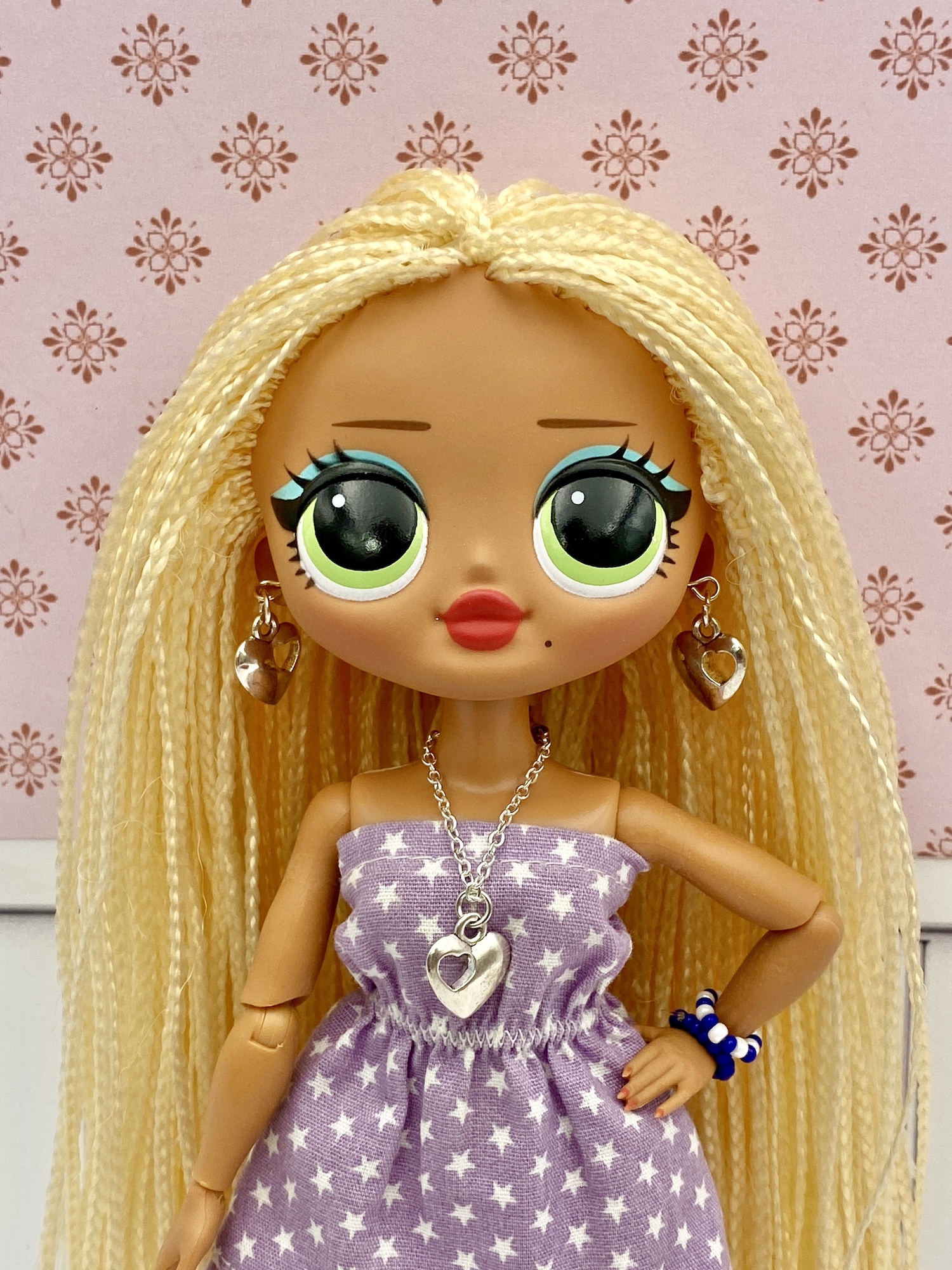 Miniaturowy ręcznie robiony zestaw biżuterii dla lalek takich jak Barbie, Fashion Royalty, Moxie, Bratz, Monster High, Rainbow High, Ever After High, LOL OMG, Disney, Licca, Jenny, Sindy i wiele innych lalek. Zestaw zawiera naszyjnik i kolczyki – serduszka.