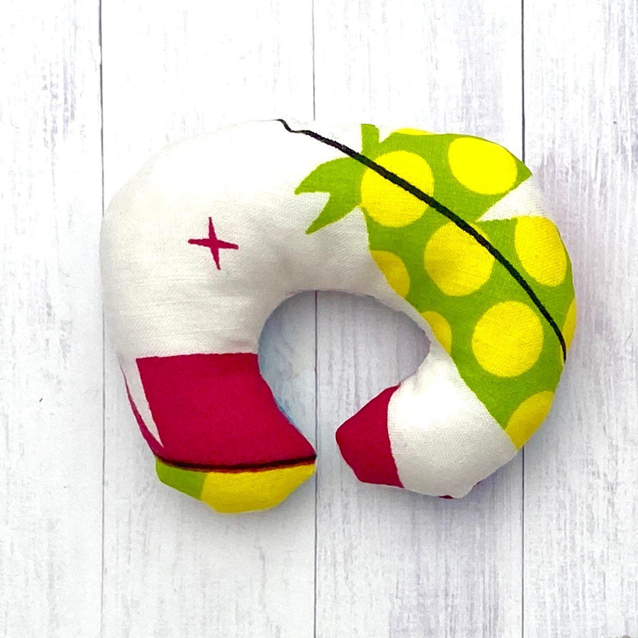 Hanmade miniature nursing pillow for miniature baby dolls such as Barbie baby, Skipper baby, Steffi baby, Happy Family baby, Krissy baby, Zuru My Mini Baby, and any other miniature baby dolls in a similar size. Made of white, cotton fabric with colorful feathers, and filled with a pillow stuffing.