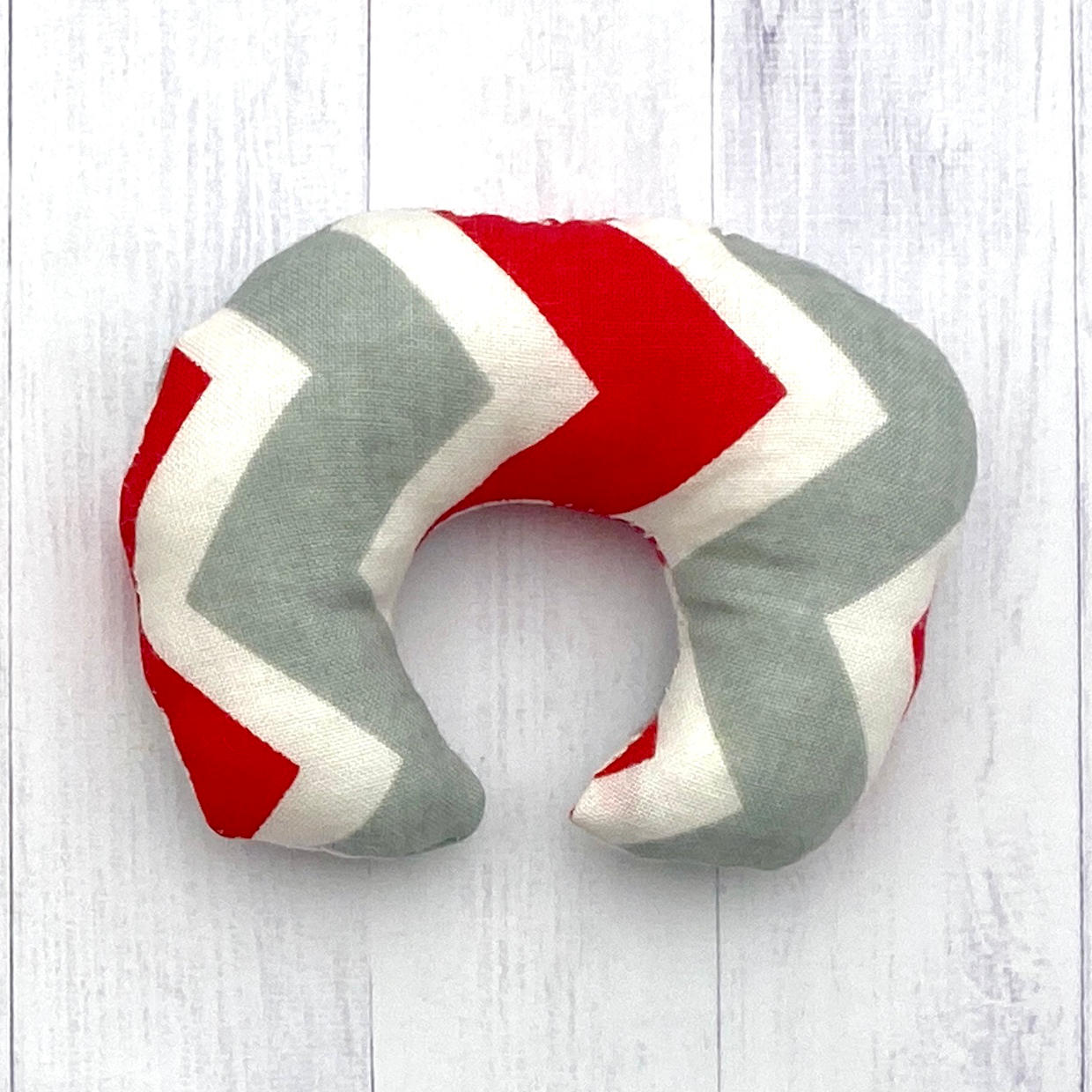 Hanmade miniature nursing pillow for miniature baby dolls such as Barbie baby, Skipper baby, Steffi baby, Happy Family baby, Krissy baby, Zuru My Mini Baby, and any other miniature baby dolls in a similar size. Made of white, red, and gray cotton fabric and filled with a pillow stuffing.