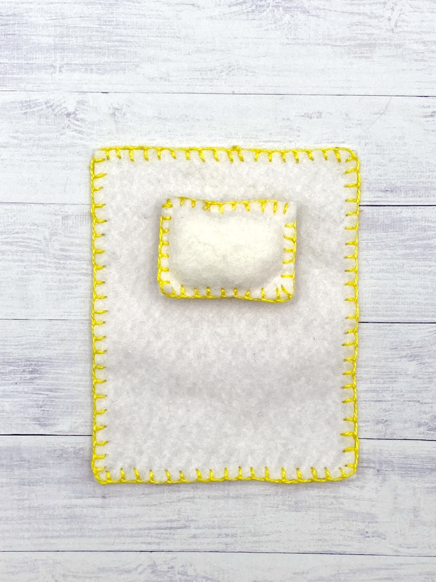 Handmade miniature blanket and pillow for miniature baby dolls such as Barbie, Steffi, Krissy, Zuru My Mini Baby, and any other miniature babies in a similar size. Made of soft white felt, edged with yellow embroidery floss, the pillow is filled with cotton wool. The set is available in other pastel colors: blue, green, pink, and yellow.