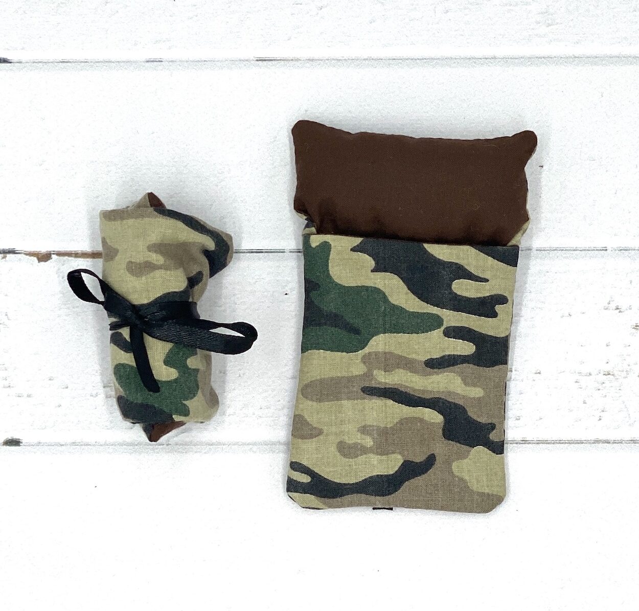 A brown-green sleeping bag made of cotton in military pattern, with a permanently sewn-in silicone ball-filled pillow and a drawstring at the bottom for tying the bag. This sleeping bag is perfect for Evi, Tommy, Petite Blythe, Kelly, Shelly, Nendoroid, Obitsu 11, Sto Dolls, Obitsuroid, MLP Equestria Girls Minis, and any doll up to 12 cm tall. Length without the drawstrings: approximately 14 cm, width: approximately 8.5 cm. This offer is for the sleeping bag only – the doll is not for sale.