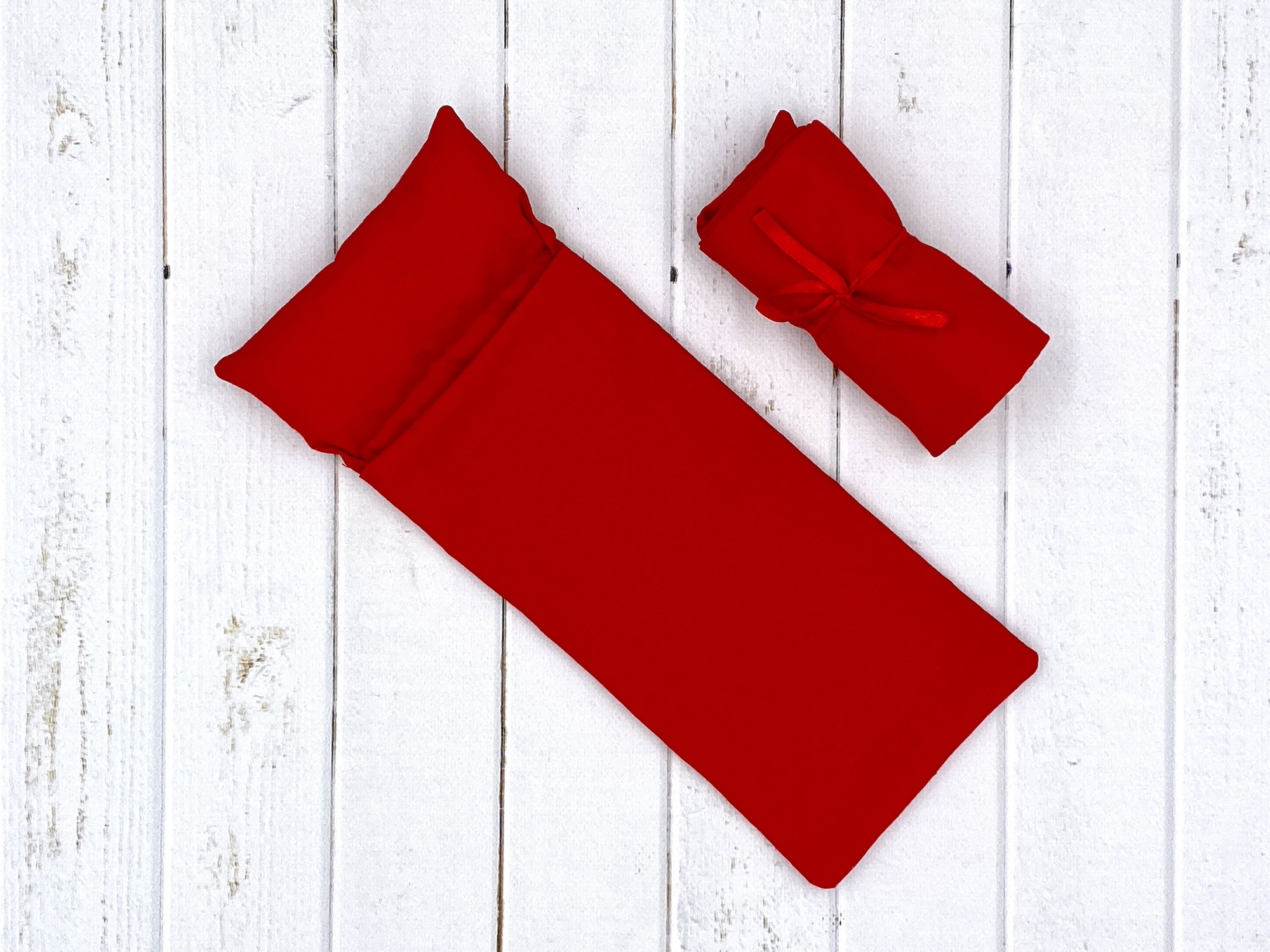 Czerwony śpiwór, uszyty z bawełny, poduszka wypełniona kulką silikonową, przyszyta na stałe, na dole tasiemka służącą do zawiązywania śpiworka. Pasuje min. na lalki Ken, Kevin, Action Man, J.I. Joe, figurki Marvela, Barbie, Steffi, Skipper, Monster High, Bratz, Disney Princess, Moxie, Ever After High i wszelkie lalki i figurki do 30 cm wysokości.