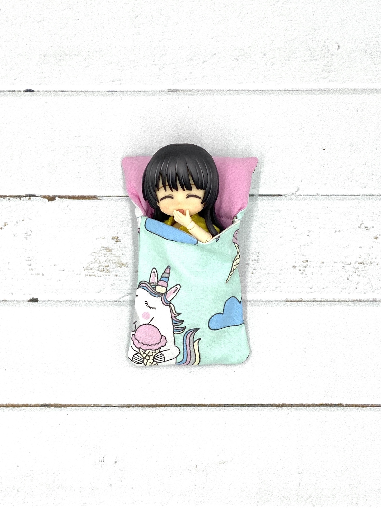 Biało-czerwony śpiworek dla lalek w jednorożce i tęcze, uszyty z bawełny, poduszka wypełniona kulką silikonową, przyszyta na stałe, na dole tasiemka służącą do zawiązywania śpiworka. Śpiworek idealny dla lalek Evi, Tommy, Petite Blythe, Kelly, Shelly, Nendoroid, Obitsu 11, Sto Dolls, Obitsuroid, MLP Equestria Girls Minis i wszelkie lalki do 12 cm wysokości.