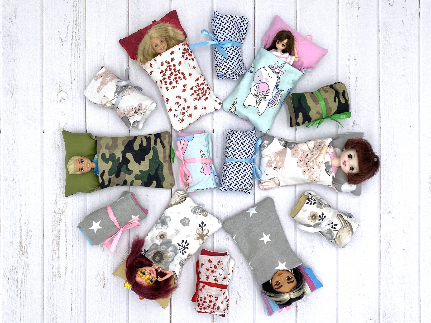 Biało-czerwony śpiworek dla lalek, uszyty z bawełny, poduszka wypełniona kulką silikonową, przyszyta na stałe, na dole tasiemka służącą do zawiązywania śpiworka. Śpiworek idealny dla lalek Chelsea, Azone Picco Neemo, Enchantimals, Lati Yellow, Pukifee, lalki bjd 16cm, Barbie Extra Minis i wszelkie lalki do 16 cm wysokości.