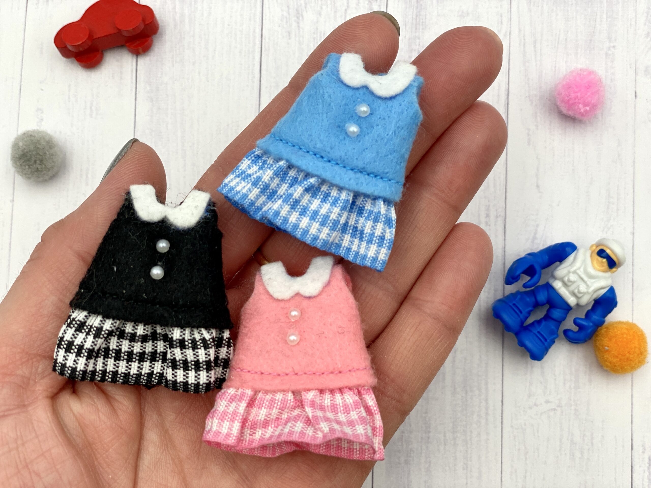 Urocza różowa sukienka dla miniaturowych lalek takich jak Petite Blythe, Dollcena, LPS Blythe, Little Pullip, Little Dal i innych lalek w podobnych rozmiarach. Sukienka uszyta z miękkiego filcu i tasiemki z falbanką, z przodu kołnierzyk i dwa diamenciki, z tyłu zapinana na rzep.
