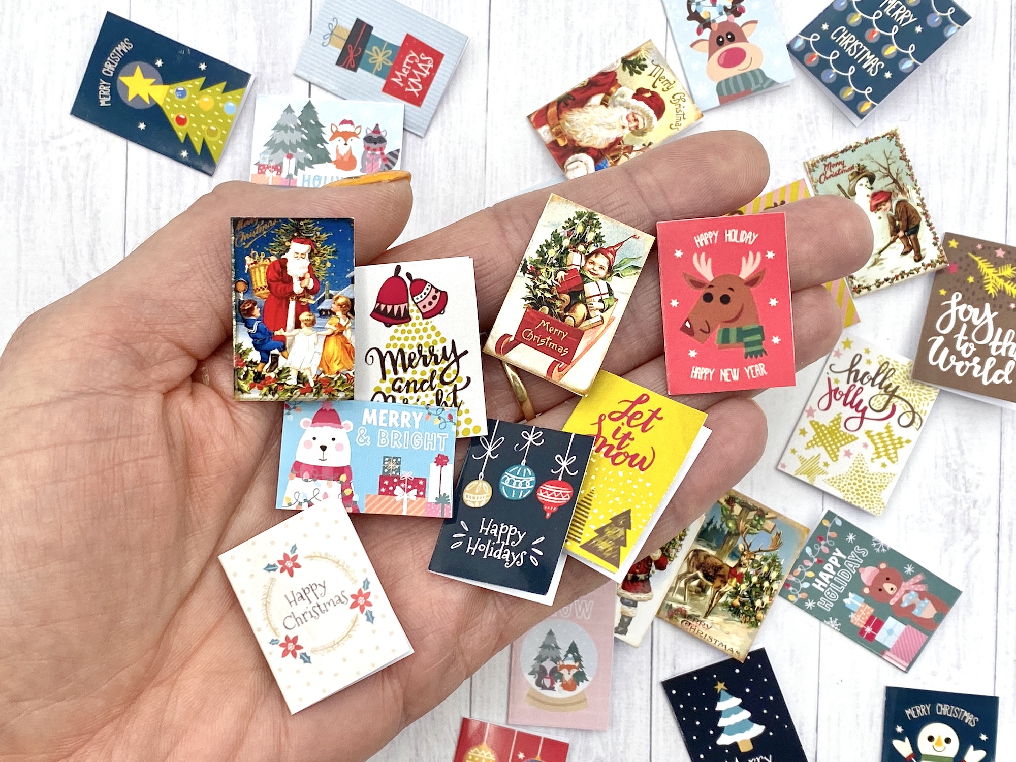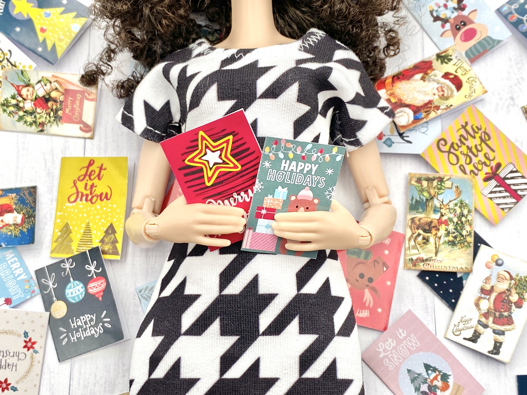Zestaw 6 miniaturowych kartek okolicznościowych na Boże Narodzenie do domku dla lalek, dioramy, room boxu i innych tego typu dekoracji. Ładny dodatek dla lalek takich jak Barbie, Blythe, Azone, Monster High i wielu innych lalek podobnych rozmiarów. Idealny świąteczny akcent do Twojego domku dla lalek. Wykonane z dobrej jakości papieru fotograficznego, dostępnych jest 5 rodzajów do wyboru