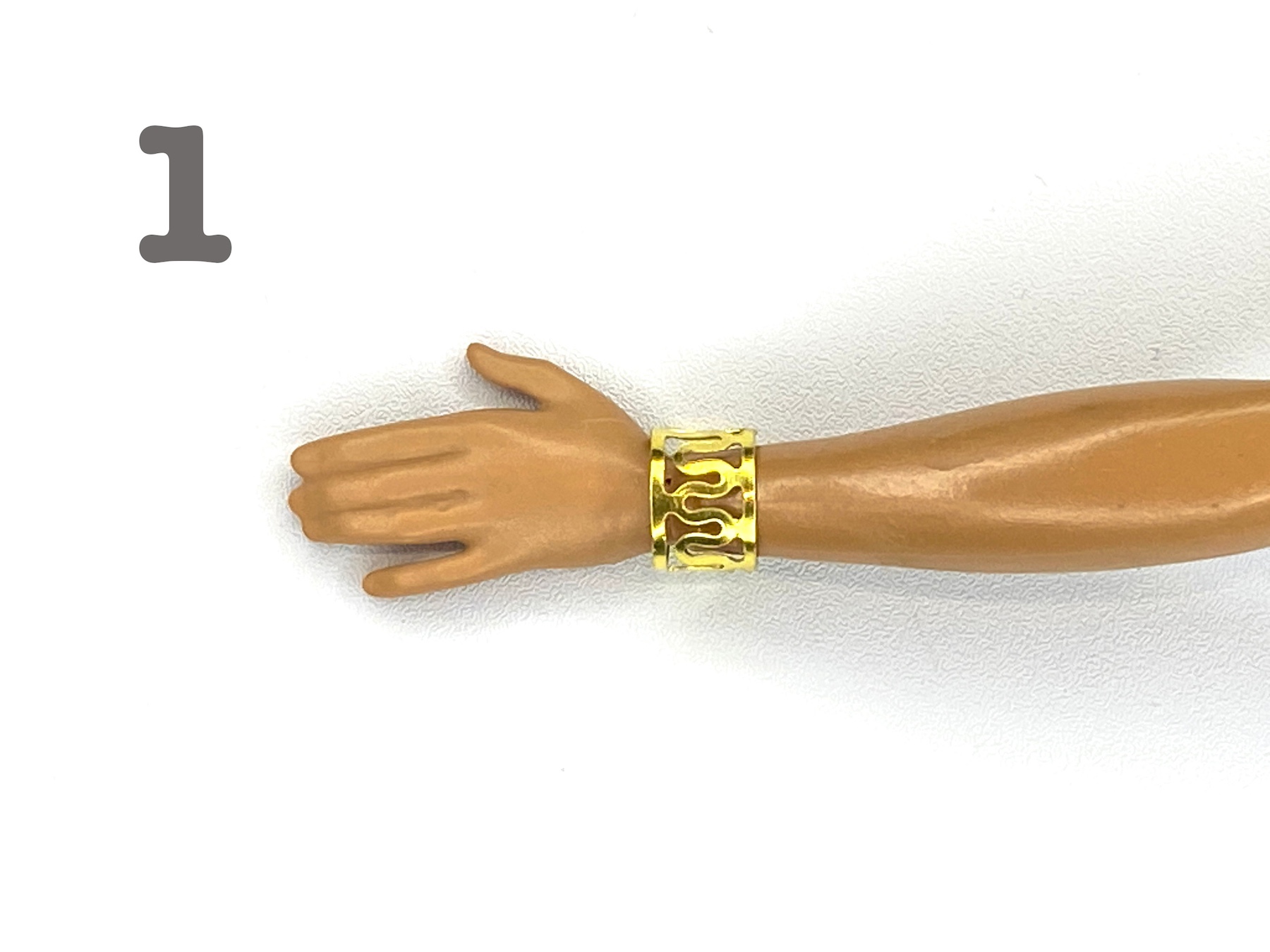 Urocza, regulowana bransoletka dla lalki wykonana ze złotego metalu, dostępna w 5 wzorach. Bransoletki są otwarte, dzięki czemu można je delikatnie rozszerzyć, aby dopasować do ręki lalki, a następnie zwęzić, aby dopasować do nadgarstka lalki. Pasuje do lalek w skali 1:6/12 cala, takich jak Barbie, Azone, Blythe, Pullip, Poppy Parker, Fashion Royalty, NuFace, Silkstone, Sindy, Monster High i innych lalek podobnej wielkości.